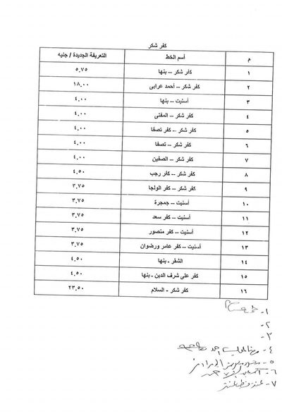 أصدر اليوم المهندس ايمن عطيه محافظ القليوبية  قرار رقم (1086) لسنة 2024 الخاص بتعديل التعريفة الجديدة والمقررة لركوب سيارات الأجرة والسرفيس بدائرة المحافظة ، وذلك علي إثر زيادة أسعار البنزين والسولار  الذي  أقره   المهندسوزير البترول والثروة المعدنية.