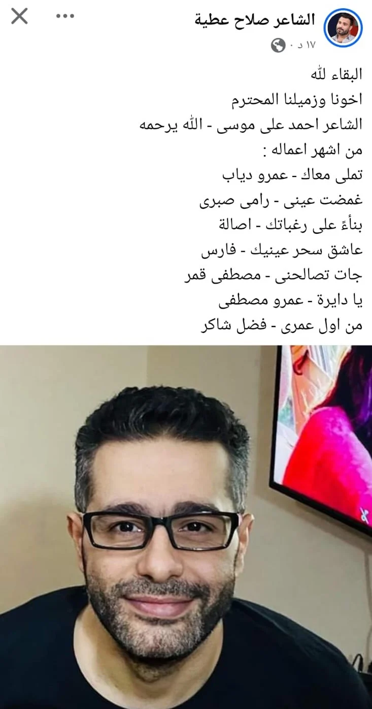 ودع الشاعر صلاح عطية صديقه الشاعر الراحل أحمد علي موسى، معلنًا عن خبر وفاته بمنشور مؤثر عبر حسابه الشخصي بموقع التواصل الاجتماعي الأشهر "فيس بوك"، قائلًا: "البقاء لله أخونا وزميلنا المحترم الشاعر أحمد على موسى الله يرحمه".