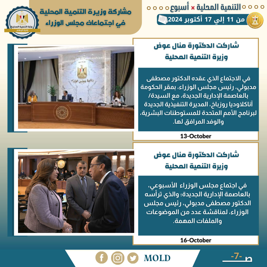 كما شاركت الدكتورة منال عوض وزيرة التنمية المحلية، في اجتماع مجلس الوزراء، بالعاصمة الإدارية الجديدة؛ والذي ترأسه الدكتور مصطفى مدبولي، رئيس مجلس الوزراء، لمناقشة عدد من الموضوعات والملفات المهمة.