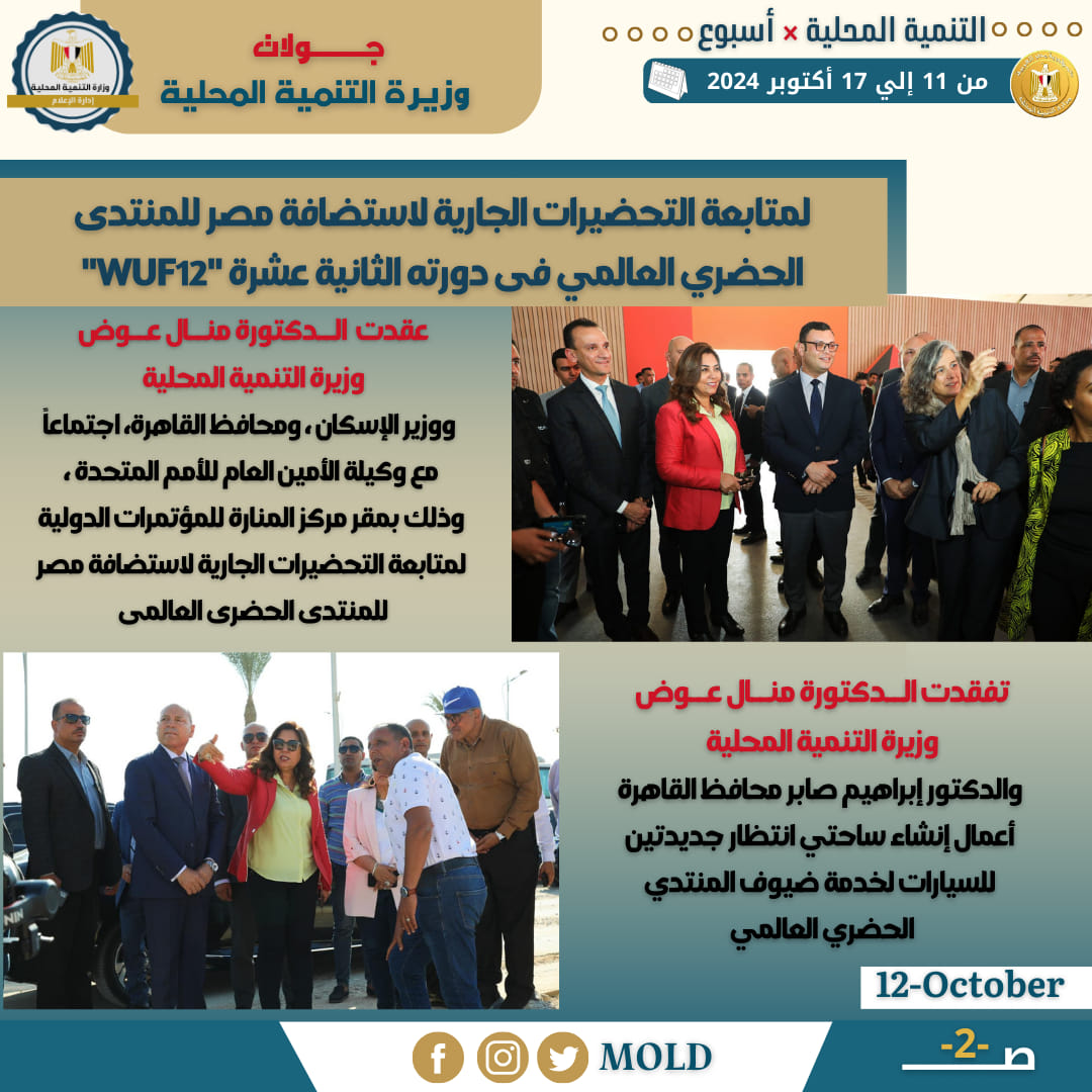 وعقدت الدكتورة منال عوض وزيرة التنمية المحلية، والمهندس شريف الشربيني، وزير الإسكان والمرافق والمجتمعات العمرانية، والدكتور إبراهيم صابر، محافظ القاهرة، اجتماعاً مع السيدة/ أناكلوديا روسباخ، وكيلة الأمين العام للأمم المتحدة والمديرة التنفيذية لبرنامج الأمم المتحدة للمستوطنات البشرية، وذلك بمقر مركز المنارة للمؤتمرات الدولية، لمتابعة التحضيرات الجارية لاستضافة مصر للمنتدى الحضري العالمي في دورته الثانية عشرة "WUF12"، فى شهر نوفمبر المقبل بالتعاون مع "الهابيتات".