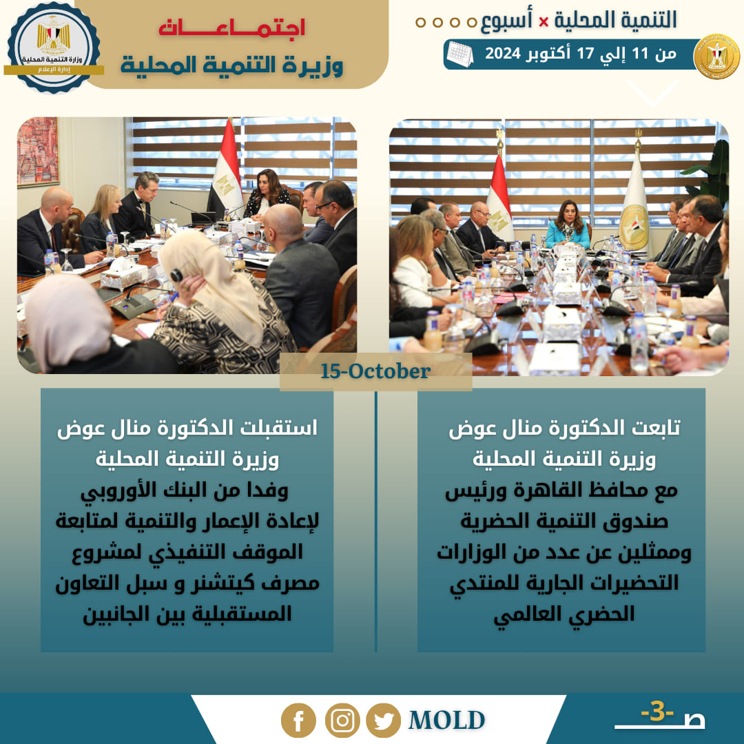 كما استقبلت وزيرة التنمية المحلية، وفد من البنك الأوروبي لإعادة الإعمار والتنمية (EBRD) برئاسة السيد / مارك ديفيس المدير الإداري لمنطقة جنوب وشرق البحر الأبيض المتوسط، والسيدة /  سو باريت رئيسة البنية التحتية بالبنك الأوروبي وهيثم عيسى، المدير الاقليمي لجنوب وشرق المتوسط بالبنك وذلك بمقر الوزارة بالعاصمة الإدارية الجديدة لمتابعة الموقف التنفيذي للأعمال والمشروعات المستهدفة في مشروع تحسين نوعية المياه بمصرف كيتشنر ضمن مكون المخلفات الصلبة.