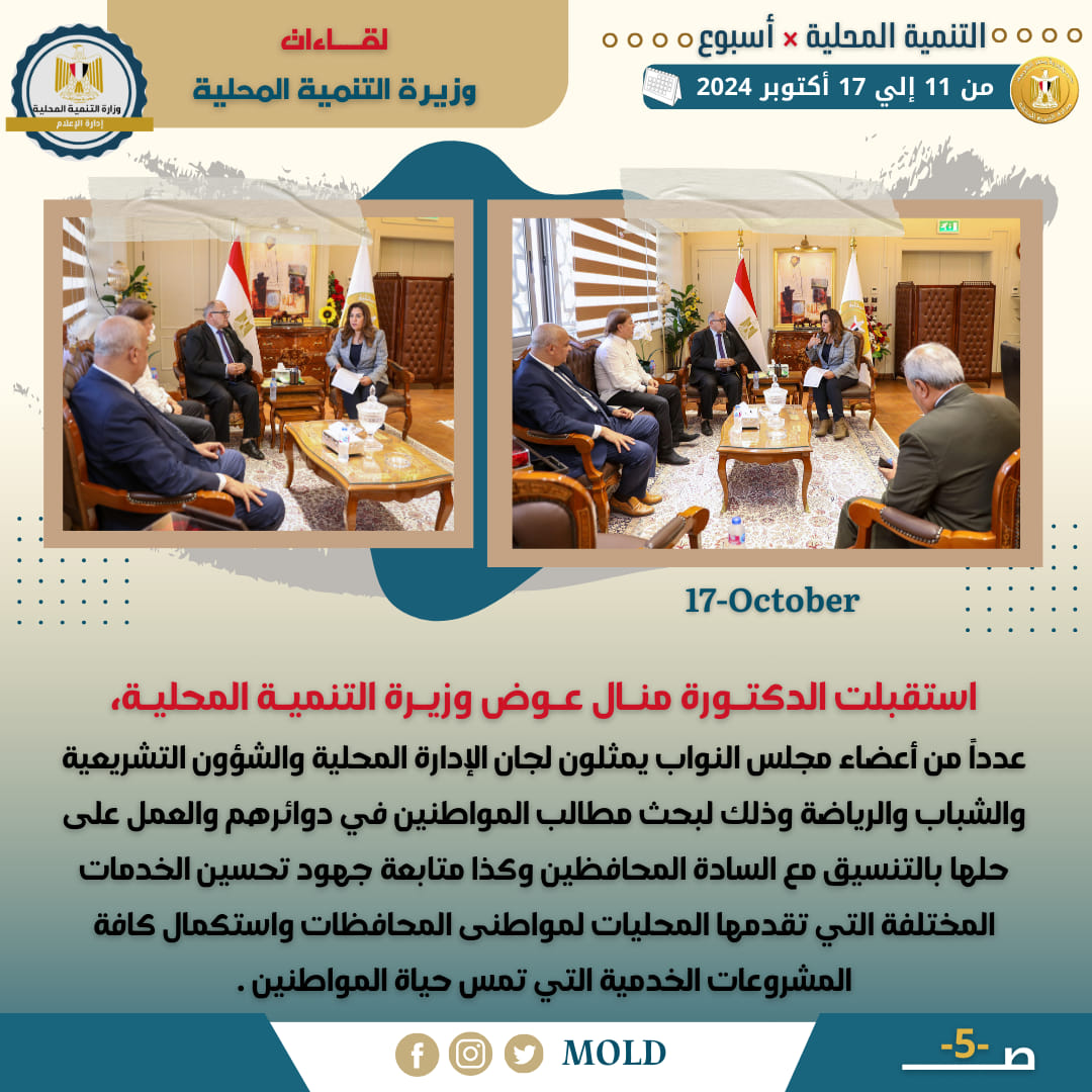 واستقبلت وزيرة التنمية المحلية، عدداً من أعضاء مجلس النواب يمثلون لجان الإدارة المحلية والشؤون التشريعية والشباب والرياضة وهم النائب أحمد البعلي والنائب اللواء دكتور ثروت سويلم والنائب حسن خليل والنائبة ريهام عبدالنبي وذلك بمقر وزارة التنمية المحلية بالعاصمة الإدارية الجديدة بحضور اللواء حمدي الجزار مستشار الوزيرة للمجالس النيابية، لبحث مطالب المواطنين في دوائرهم والعمل على حلها بالتنسيق مع السادة المحافظين وكذا متابعة جهود تحسين الخدمات المختلفة التي تقدمها المحليات لمواطنى المحافظات واستكمال كافة المشروعات الخدمية التي تمس حياة المواطنين.
