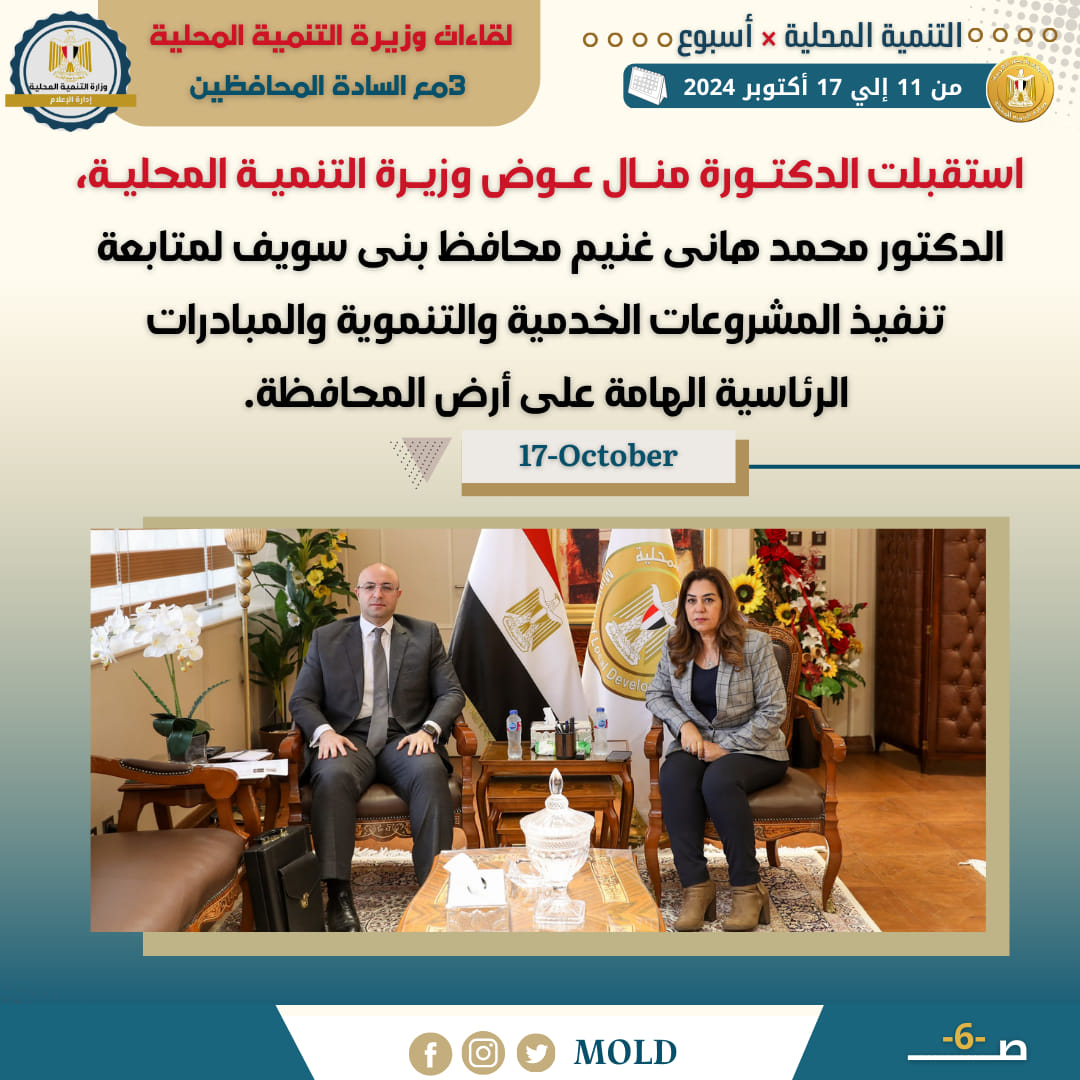 كما استقبلت الدكتورة منال عوض وزيرة التنمية المحلية، الدكتور محمد هانى غنيم محافظ بنى سويف، بمقر وزارة التنمية المحلية بالعاصمة الإدارية الجديدة ،لمتابعة تنفيذ التوجيهات الرئاسية وتكليفات رئيس مجلس الوزراء فيما يخص تنفيذ المشروعات الخدمية والتنموية التى تهم المواطنين فى مختلف المجالات والمبادرات الرئاسية الهامة على ارض المحافظة.
