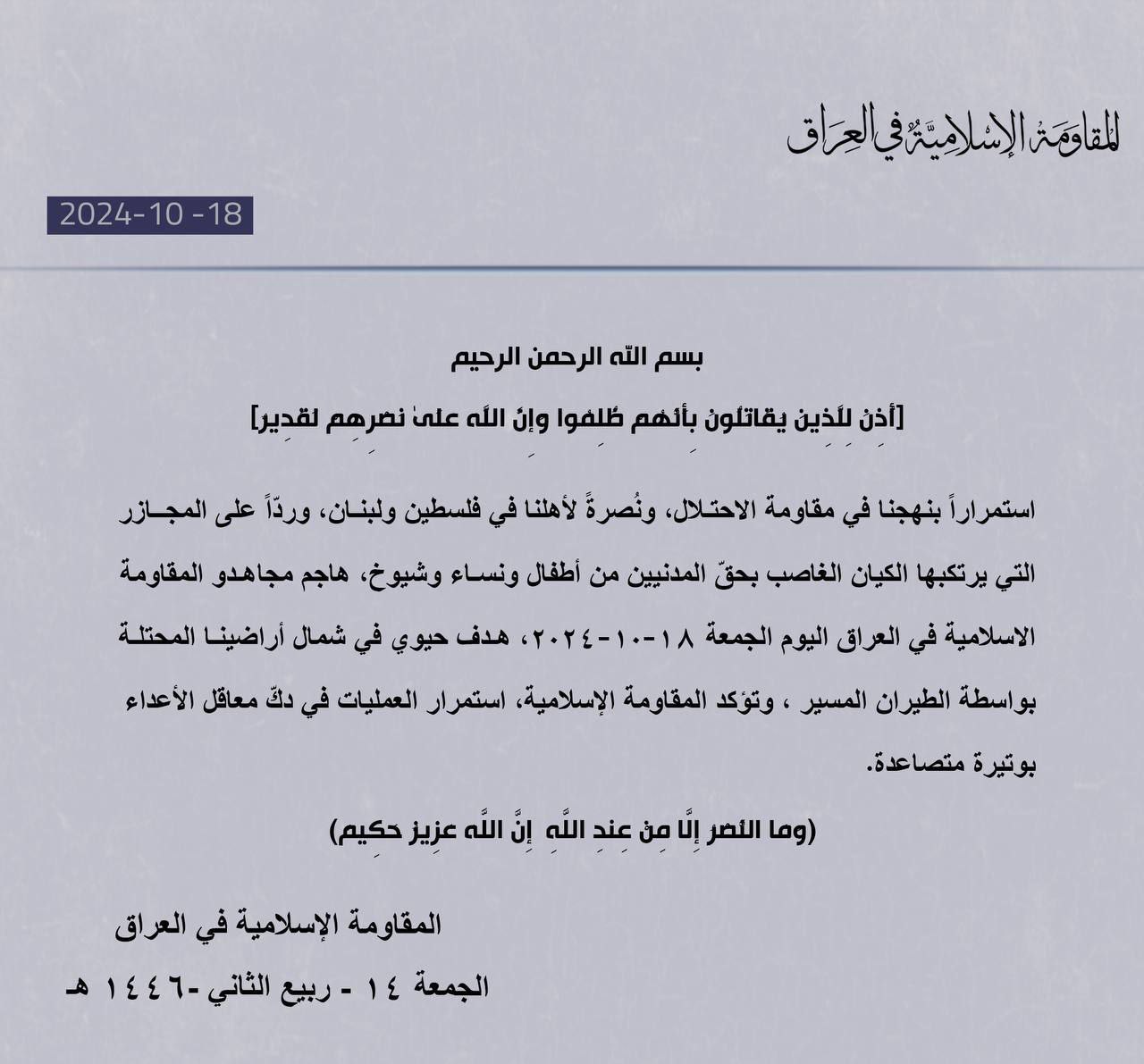 وقالت المقاومة العراقية في بيانها: استمرارًا بنهجنا في مقاومة الاحتلال، ونُصرةً لأهلنا في فلسطين ولبنان، وردّاً على المجازر التي يرتكبها الكيان الغاصب بحقّ المدنيين من أطفال ونساء وشيوخ، هاجم مجاهدو المقاومة الاسلامية في العراق صباح اليوم الجمعة 18-10-2024، هدف حيوي في شمال أراضينا المحتلة بواسطة الطيران المسير، وتؤكد المقاومة الإسلامية، استمرار العمليات في دكّ معاقل الأعداء بوتيرة متصاعدة.