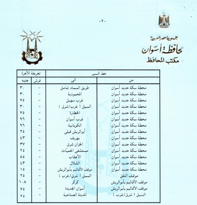 وعقب صدور قرار لجنة التسعير التلقائى للمنتجات البترولية بزيادة أسعار الوقود، قرر اللواء دكتور إسماعيل كمال محافظ أسوان تعديل تعريفة الأجرة للمواصلات الداخلية والخارجية وسيارات نقل الركاب السيرفيس داخل المحافظة وبين المراكز وزياديتها بنسبة تتراوح ما بين 12 % إلى 15 %.