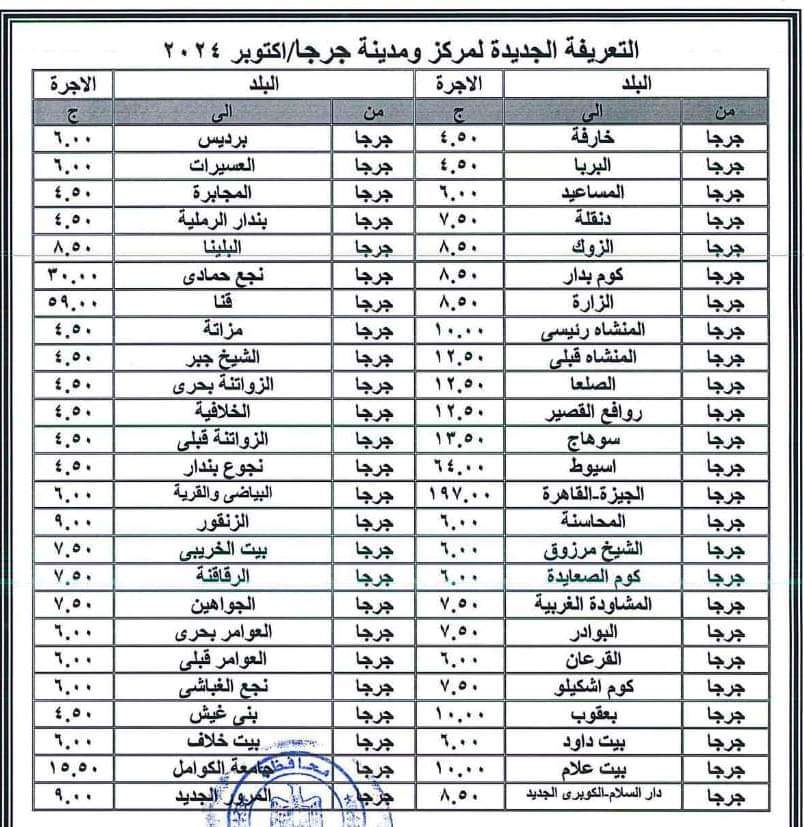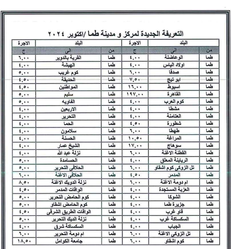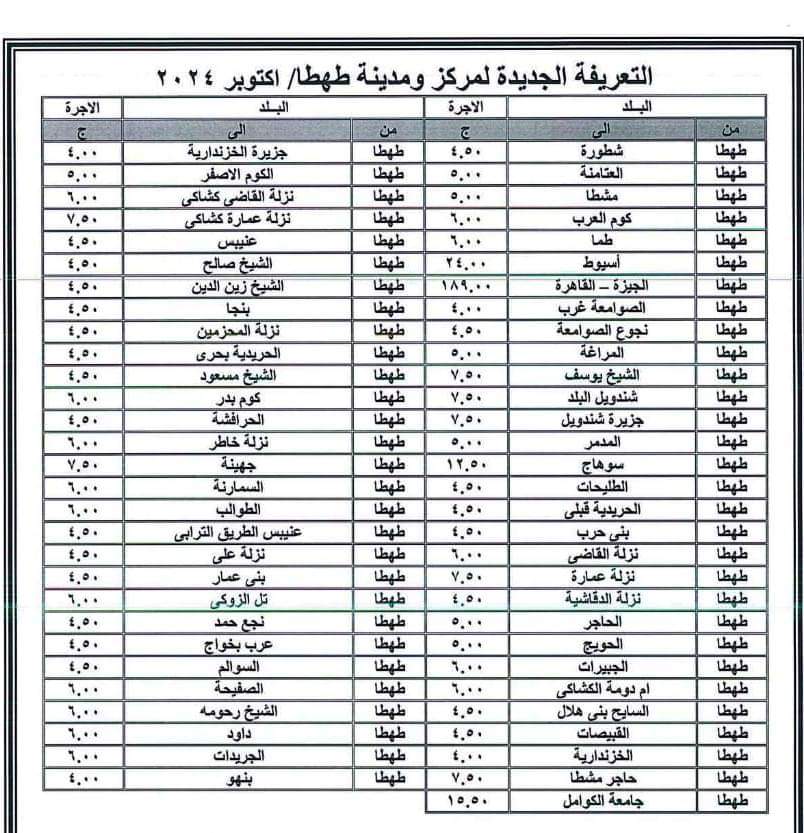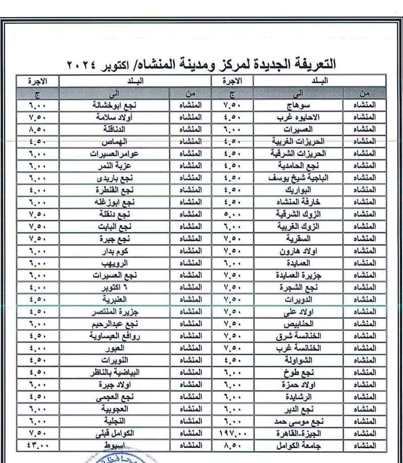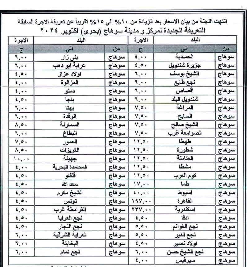 أعلنت محافظة سوهاج برئاسة اللواء عبد الفتاح سراج محافظ الإقليم، اليوم الجمعة، تعريفة الركوب الجديدة للمواصلات الداخلية والخارجية، وسيارات نقل الركاب السرفيس والتاكسي للنقل الداخلي بالمدن والمراكز وبين المحافظات، وكذلك بين المدن والمراكز والقرى التابعة للمحافظة.