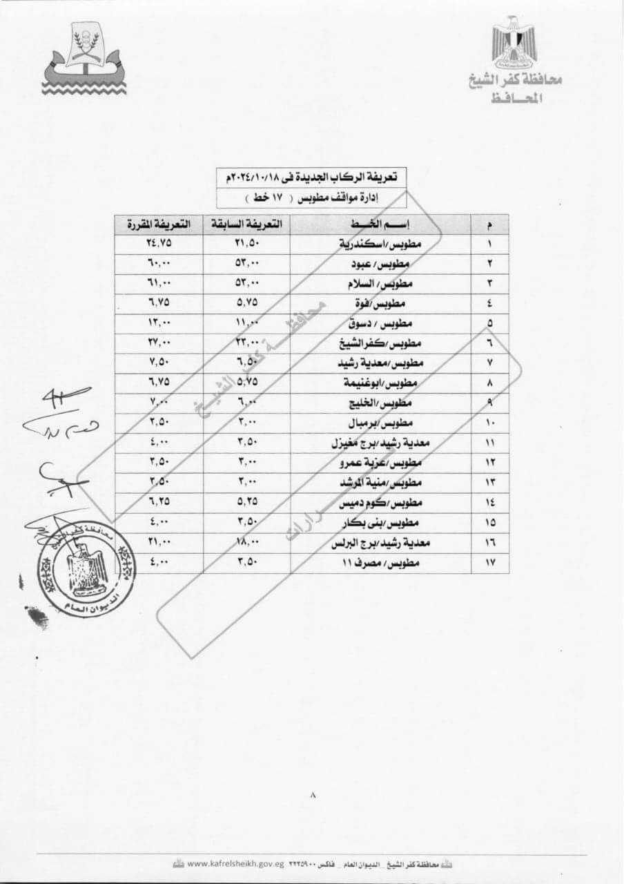 اعتمد محافظ كفر الشيخ اللواء دكتور علاء عبد المعطي، اليوم الجمعة، التعريفة الجديدة لنقل الركاب عقب قرار لجنة التسعير التلقائي للمنتجات البترولية المعنية بوزارة البترول برفع أسعار المنتجات البترولية اعتباراً من اليوم الجمعة، محذرًا من استغلال المواطنين في تحصيل مبالغ أزيد من التعريفة المقررة.