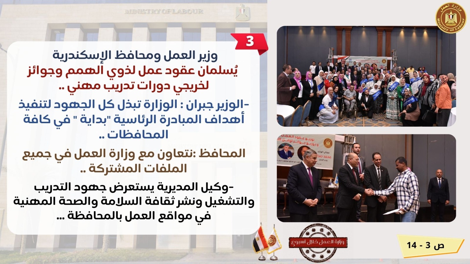 وتواصل مديريات العمل في المحافظات تنفيذ توجيهات الوزير جبران، بالاستمرار في تنفيذ أهداف المبادرة الرئاسية "بداية جديدة لبناء الإنسان" وذلك من خلال نشر ثقافة السلامة والصحة المهنية في مواقع العمل والإنتاج، وكذلك تكثيف الجهود في مراكز التدريب المهني لتنمية مهارات الشباب على مهن المستقبل، في اطار خطة الوزارة "التدريب من أجل التشغيل"وتقديم الخدمات للمواطنين بشكل لائق وكريم.