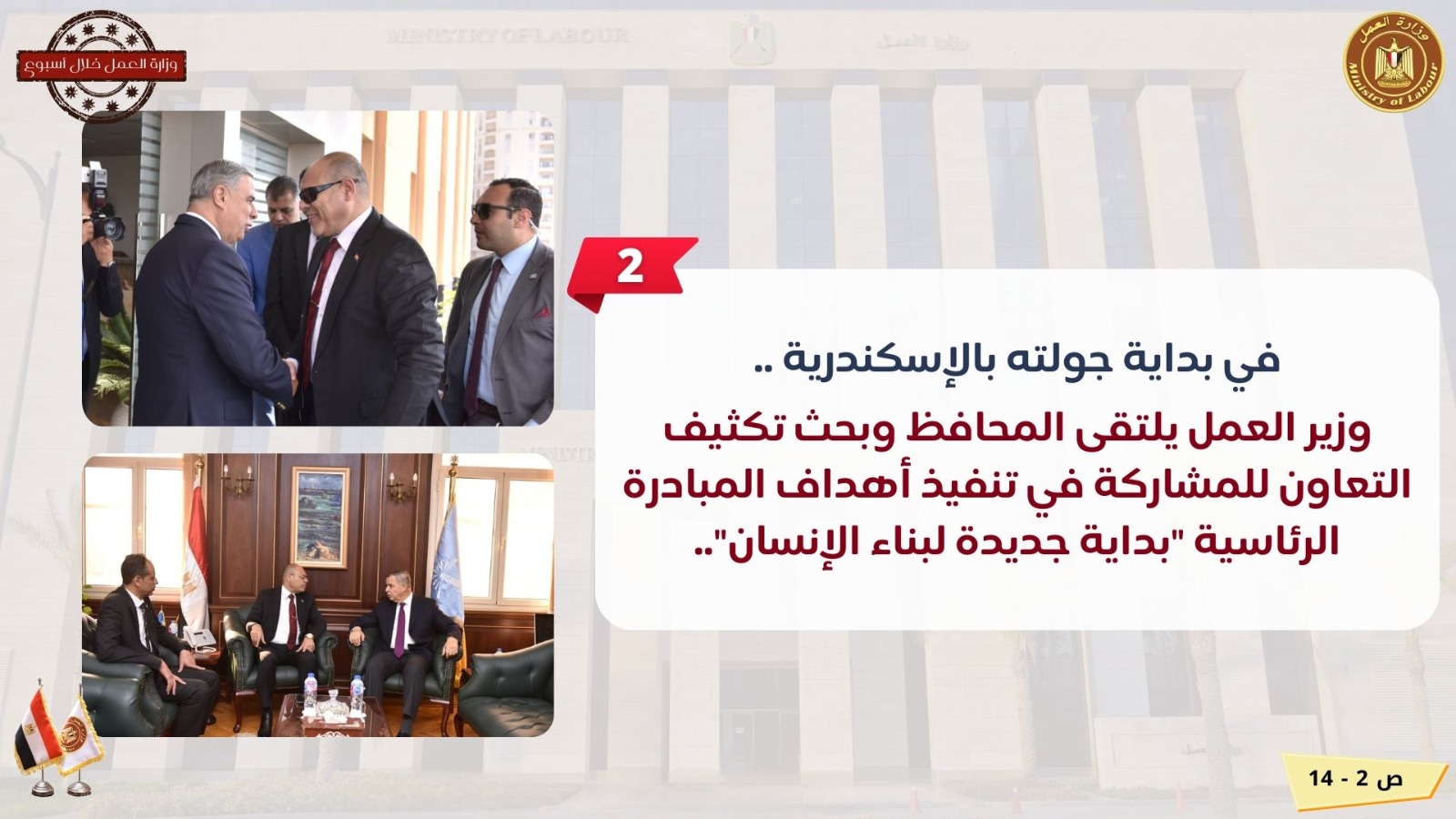 وفي جولة داخل محافظة الإسكندرية، التقى وزير العمل، مع الفريق أحمد خالد حسن سعيد محافظ الإسكندرية، في بداية الجولة، بحضور محمد كمال وكيل مديرية العمل بالمحافظة، وذلك للتباحث بشأن مجموعة من الملفات المشتركة، كما سلم وزير العمل، ومحافظ الإسكندرية، 34 عقد من أصل 69 عقد عمل لذوي الهمم، تم توفيرها خلال هذا الشهر، لمواطنين بمحافظة الإسكندرية، وذلك في إطار خطة دمجهم في سوق العمل تنفيذاً لتوجيهات الرئيس عبدالفتاح السيسي.
