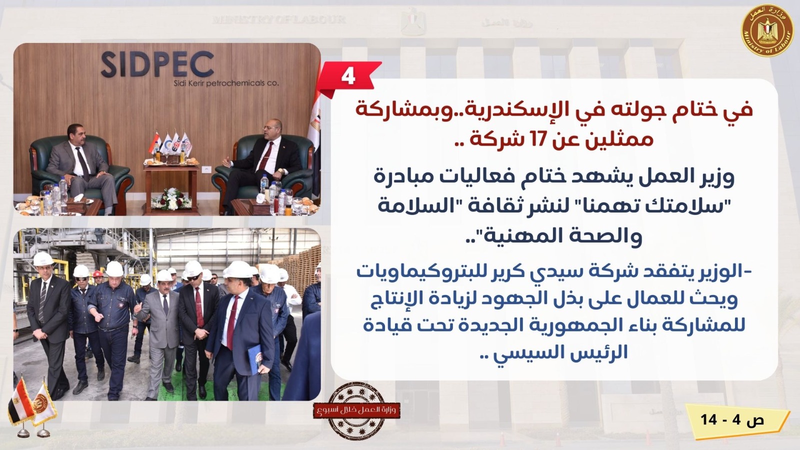 وكذلك تسليم جوائز لعدد 44 من أصل 120 من المتفوقين خريجي "برنامج تدريبي" بالتعاون مع شركة قدرة للتنمية والحلول التكنولوجية للتعليم ، وفي ختام جولته في المحافظة، شهد الوزير جبران، ختام فعاليات مبادرة "سلامتك تهمنا" المنعقدة في شركة سيدي كرير للبتروكيماويات "سيدبك"، برئاسة المهندس محمد ابراهيم رئيس مجلس الإدارة والعضو المنتدب، والتي أطلقتها وزارة العمل بالتعاون مع 17 شركة من المنطقة الغربية لمحافظة الإسكندرية، بهدف نشر ثقافة السلامة والصحة المهنية في مواقع العمل والإنتاج، في إطار تنفيذ أهداف المبادرة الرئاسية "بداية جديدة لبناء الإنسان.