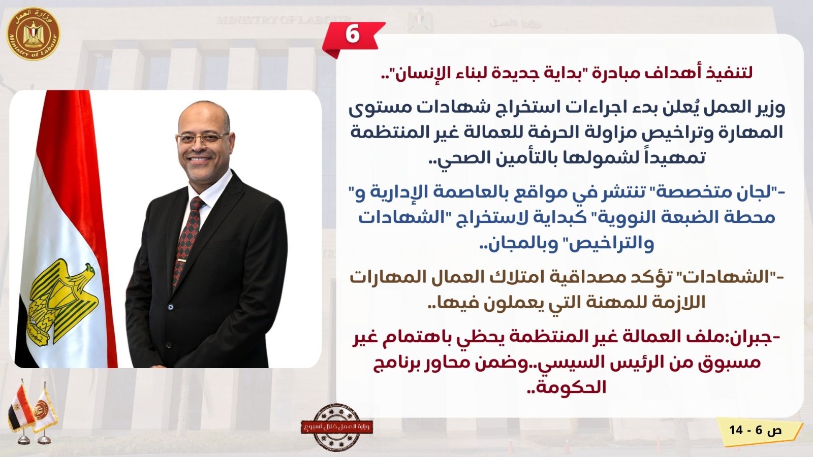 ومن أبرز الأنشطة والتوجيهات، أعلن محمد جبران وزير العمل، عن البدء في نزول "لجان متخصصة"، من إدارتي "العمالة غير المنتظمة"، و"التدريب المهني"، ومديريتي عمل القاهرة ومطروح، بالتنسيق مع هيئتي" التأمينات الاجتماعية "، و"التأمين الصحي"، إلى بعض مواقع للعمالة غير المنتظمة في العاصمة الإدارية الجديدة، ومشروع محطة الضبعة النووية، لاختبارهم واستخراج شهادات قياس مستوى المهارة، وتراخيص مزاولة الحرفة لهم، وبالمجان، تمهيدًا للتأمين الصحي عليهم.