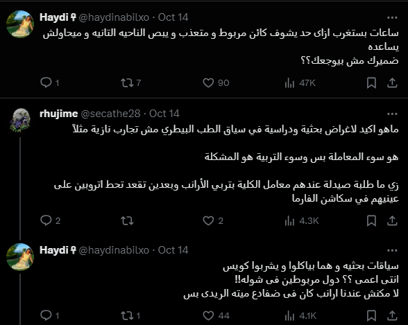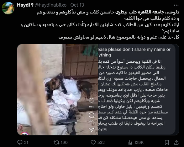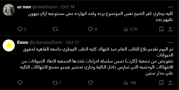 وأطلق مستخدمي السوشيال ميديا هشتاج يطالب فيه بإقالة عميد كلية الطب البيطري ومحاسبة المسؤولين، وسط مطالب بتوضيح من قِبل الجامعة لما يحدث داخل الكلية من تعذيب للحيوانات.