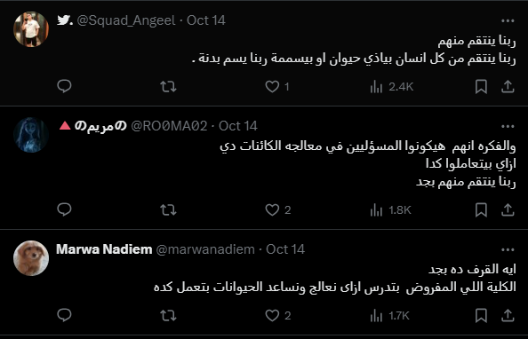 علق الرواد على الفيديوهات المنتشرة للحيوانات والتي جاءت كالأتي، " دلوقتى جامعه القاهره طب بيطرى حابسين كلاب و مش بيأكلوهم و بيعذبوهم و ده كلام طالب من جوا الكليه ازاى كليه بعدد كبير من الطلاب كده شايفين الاداره بتأذى كائن حى و بتعذبه و ساكتين و سايبنهم؟ كل حد على علم و درايه بالموضوع شال ذنبهم لو محاولش يتصرف"، " عايشين في اسوء فترة والله .. الاكونت ده بيتكلم عن كلية الطب البيطري في القاهرة بياخدو الكلاب السليمة ويتعلمو فيها ! ده يرضي ربنا ؟ دي ارواح ربنا خالقها ليه التعذيب احنا وصلنا لمرحلة انعدام الرحمة"، " ساعات بستغرب ازاى حد يشوف كائن مربوط و متعذب و يبص الناحيه التانيه و ميحاولش يساعده".
