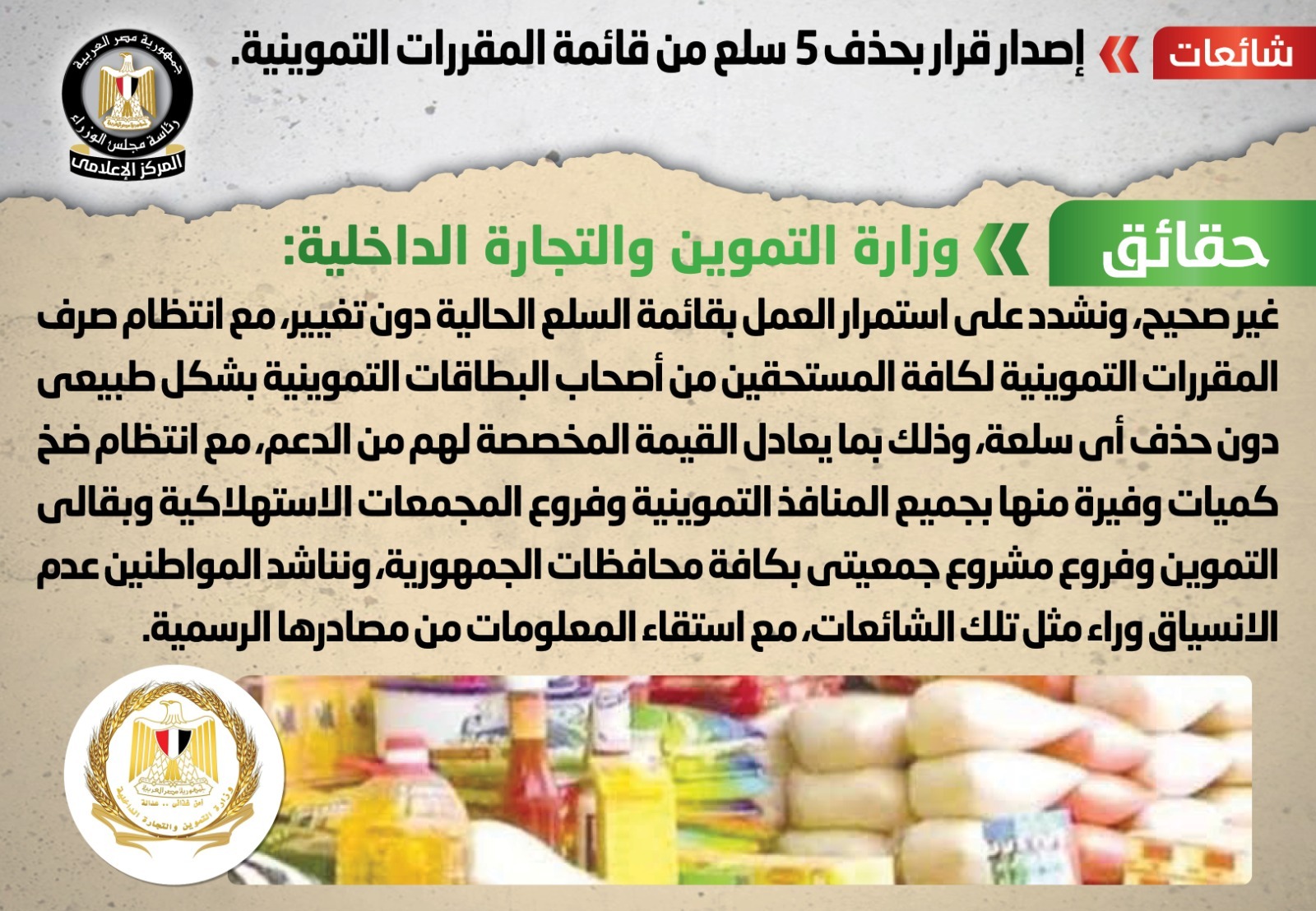 أكد المركز الإعلامي لمجلس الوزراء ووزارة التموين والتجارة الداخلية، أنه لا صحة لحذف 5 سلع من قائمة المقررات التموينية، مُشددةً على استمرار العمل بقائمة السلع الحالية دون تغيير، مع انتظام صرف المقررات التموينية للمستحقين كافة من أصحاب البطاقات التموينية بشكل طبيعي من دون حذف أي سلعة.