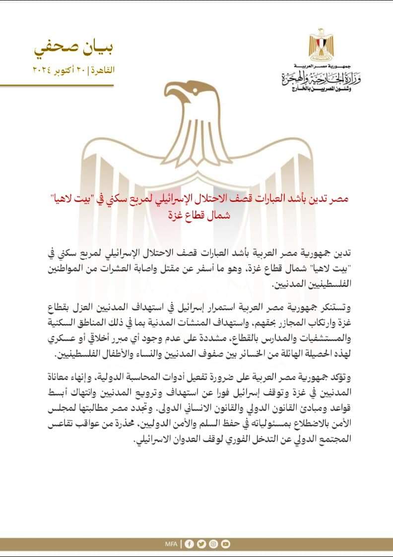 تدين مصر بأشد العبارات قصف الاحتلال الإسرائيلي لمربع سكني في بيت لاهيا شمال قطاع غزة، ما أسفر عن مقتل وإصابة العشرات من المدنيين الفلسطينيين.