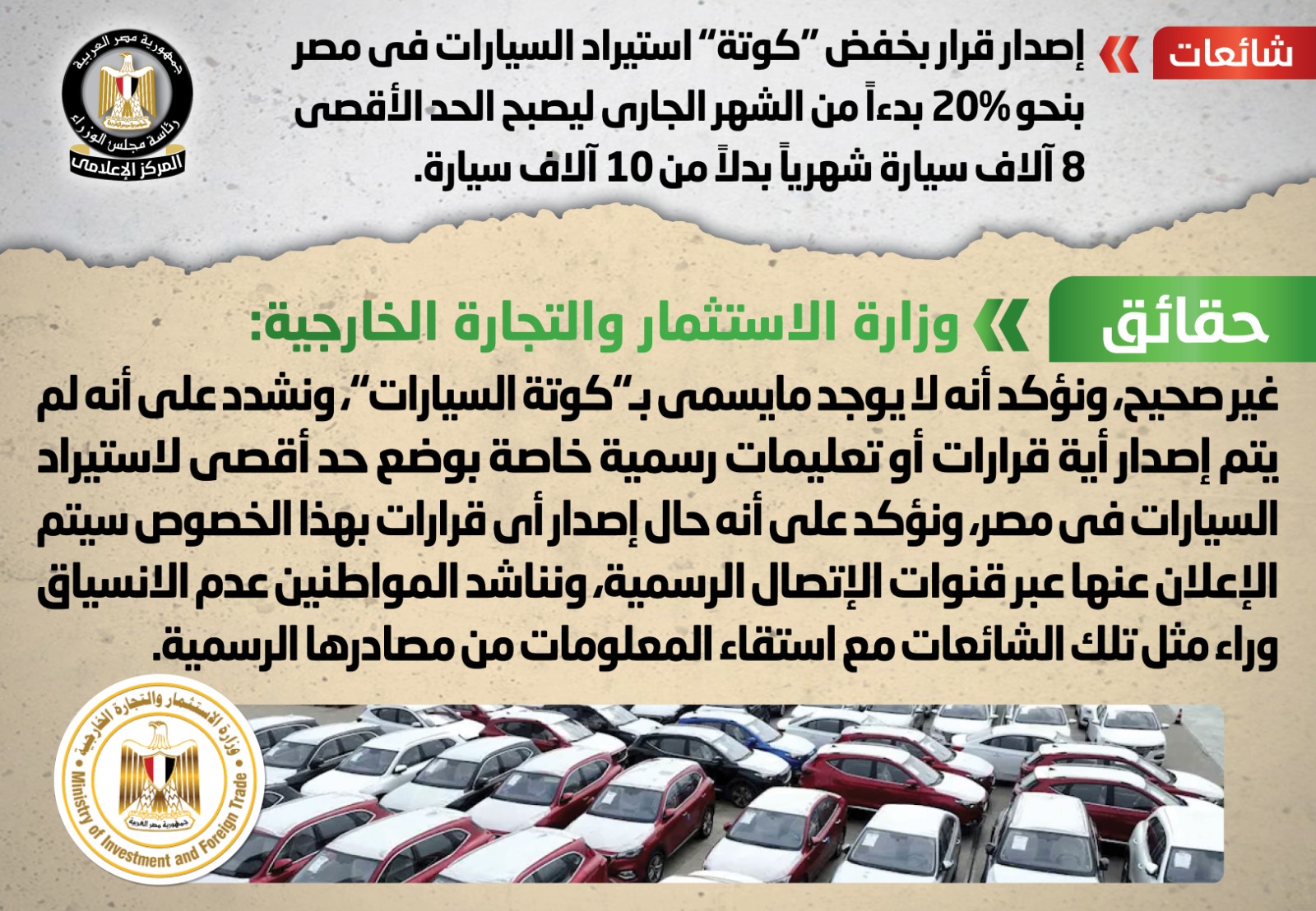 تداولت بعض صفحات التواصل الاجتماعي أنباء بشأن إصدار قرار بخفض "كوتة" استيراد السيارات في مصر بنحو 20% بدءاً من الشهر الجاري ليصبح الحد الأقصى 8 آلاف سيارة شهرياً بدلاً من 10 آلاف سيارة، وقد قام المركز الإعلامي لمجلس الوزراء بالتواصل مع وزارة الاستثمار والتجارة الخارجية، والتي نفت تلك الأنباء، مُؤكدةً أنه لا يوجد ما يسمى بـ "كوتة السيارات"، مشددةً على أنه لم يتم إصدار أية قرارات أو تعليمات رسمية خاصة بوضع حد أقصى لاستيراد السيارات في مصر، مؤكدةً على أنه حال إصدار أي قرارات بهذا الخصوص سيتم الإعلان عنها عبر قنوات الاتصال الرسمية، مناشدةً المواطنين عدم الانسياق وراء مثل تلك الشائعات مع استقاء المعلومات من مصادرها الرسمية.