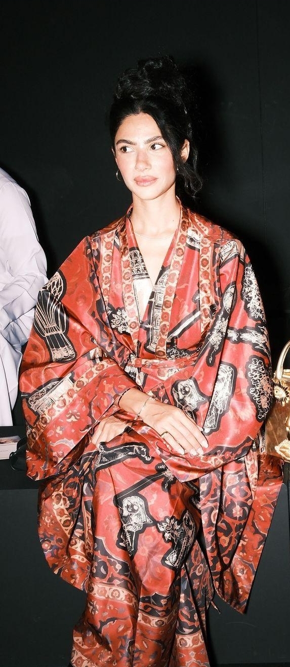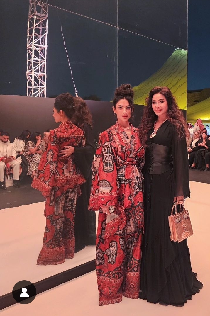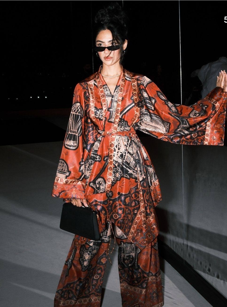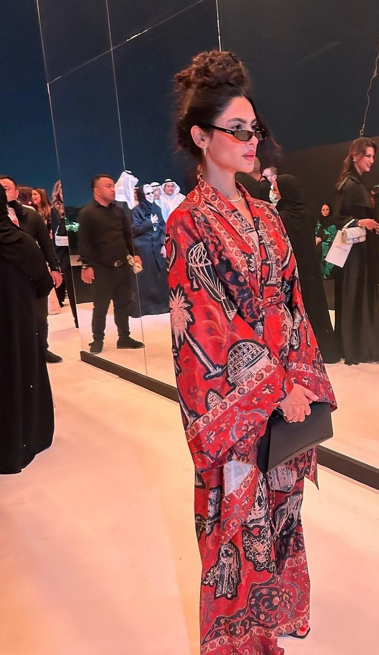 وتألقت هدي المفتي بإطلالة آسيوية راقية وذلك خلال حضورها احد فعاليات أسبوع الموضة بالرياض، حيث فستانا قصيرا ونسقت معه بنطال فضفاض صمم من الساتان المزركش، بالألوان الأحمر في الأسود والبيج.