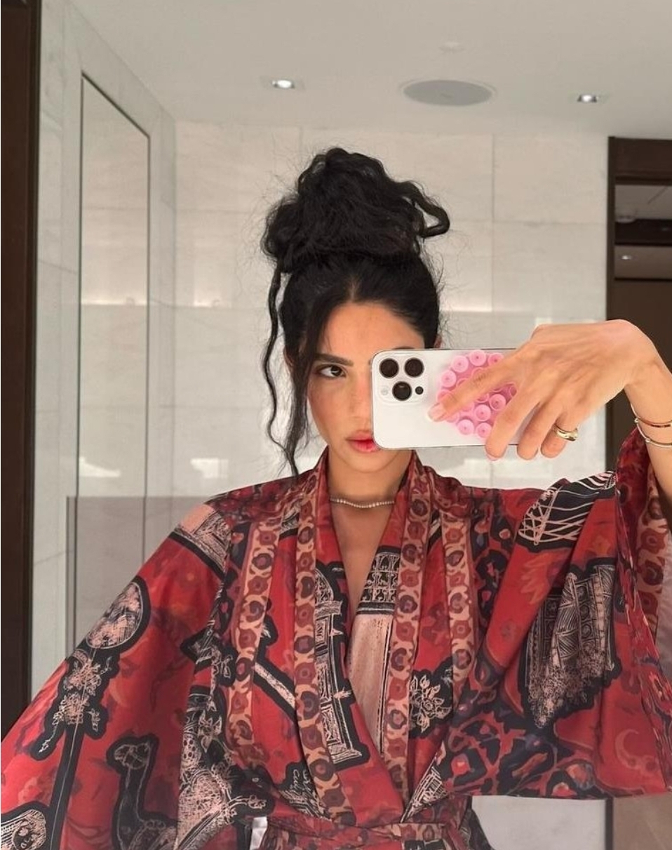 واختارت لك خصلات شعرها لاعلى ووضعت مكياجًا جذابًا مرتكزًا على الألوان الترابية مع تحديد عينيها بالكحل والماسكرا السوداء ولون النود في الشفاه مما عكس سحر ملامحها بشكل واضح  وجذاب.