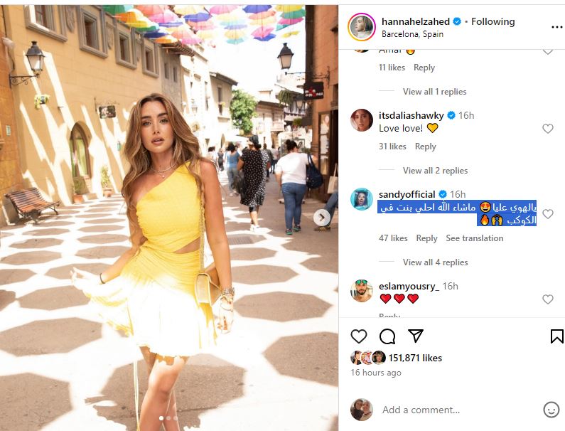 وحرصت الفنانة ساندى على التعليق وإبداء رأيها بإطلالة هنا الزاهد عبر الإنستجرام، قائلة: " يالهوي عليا ماشاء الله احلي بنت في الكوكب".