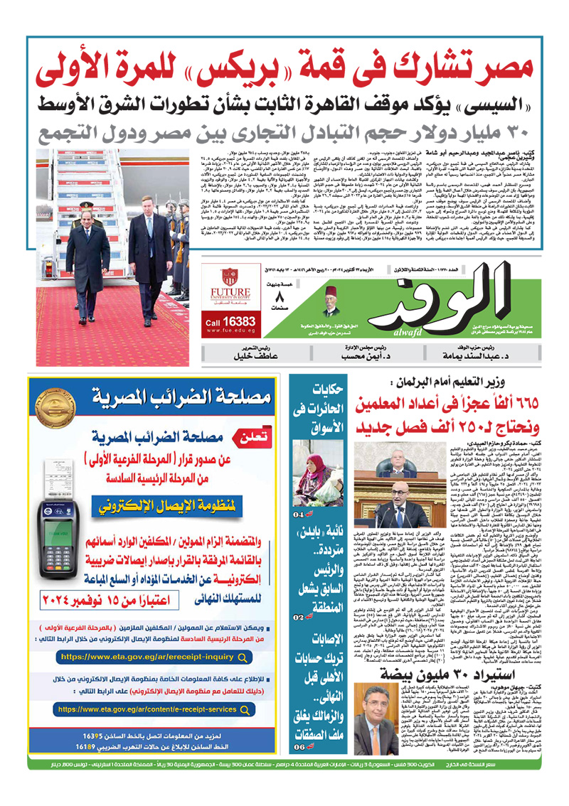 تنشر جريدة الوفد في عددها الصادر غدا الأربعاء، العديد من الموضوعات والتقارير الإخبارية المهمة، أبرزها:"مصر تشارك في قمة “بريكس” للمرة الأولى".