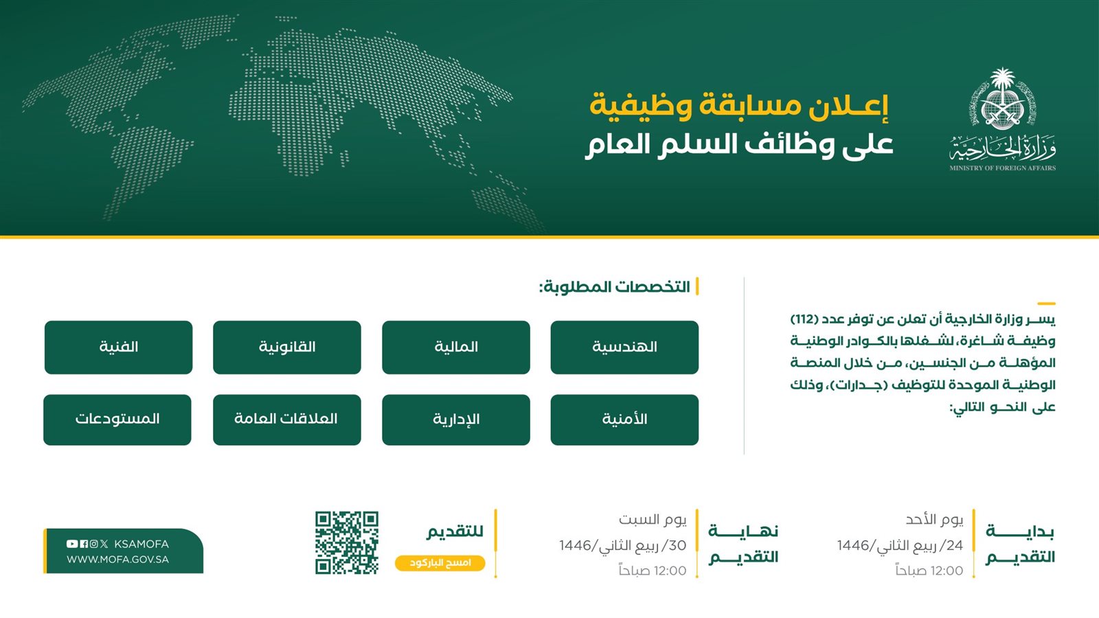 وكانت وزارة الخارجية في المملكة العربية السعودية، أعلنت عبر حسابها الرسمي بموقع التواصل الاجتماعي “X” تويتر سابقا، عن توفر 112 وظيفة شاغرة، لشغلها بالكوادر الوطنية (السعوديين فقط)، المؤهلة من الرجال والنساء.
