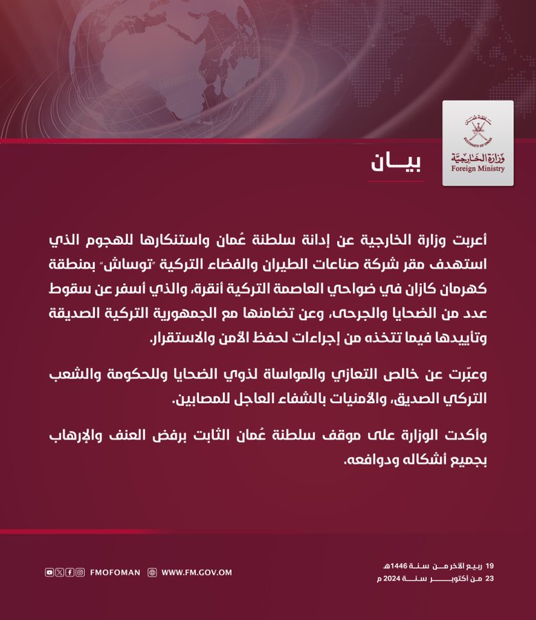 الخارجية العمانية تدين الهجوم على مقر شركة صناعات الطيران والفضاء التركية