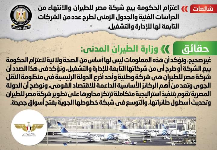 تداولت إحدى الصحف وبعض المواقع الإلكترونية ووسائل التواصل الاجتماعي أنباء بشأن اعتزام الحكومة بيع شركة مصر للطيران والانتهاء من الدراسات الفنية والجدول الزمني لطرح عدد من الشركات التابعة لها للإدارة والتشغيل، وقد قام المركز الإعلامي لمجلس الوزراء بالتواصل مع وزارة الطيران المدني، والتي نفت تلك الأنباء، مُؤكدةً أن هذه المعلومات ليس لها أساس من الصحة ولا نية لاعتزام الحكومة بيع الشركة أو طرح أي من شركاتها التابعة للإدارة والتشغيل، مؤكدةً في هذا الصدد أن شركة مصر للطيران هي شركة وطنية وأحد أذرع الدولة الرئيسية في منظومة النقل الجوي وتعد من أهم الركائز الأساسية الداعمة للاقتصاد القومي، موضحةً أن الدولة المصرية تقوم بتنفيذ استراتيجية متكاملة ترتكز محاورها على تطوير شركة مصر للطيران وتحديث أسطول طائراتها، والتوسع في شبكة خطوطها الجوية بفتح أسواق جديدة.