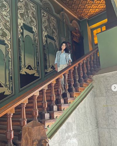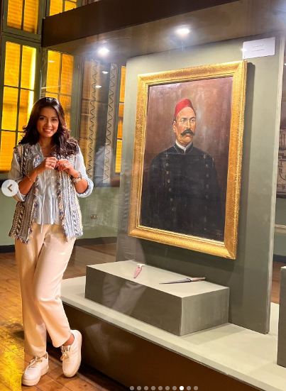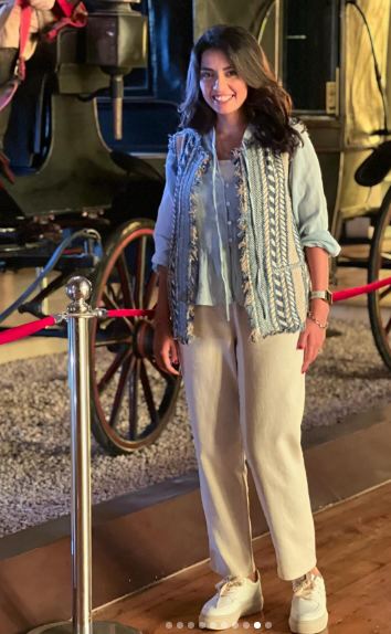 واختارت تسريحة شعر جذابة على طريقة الويفي الواسع ووضعت مكياجًا ناعمًا مرتكزًا على الألوان الترابية ليتناغم مع لون بشرتها الخمرية مع لون الوردي في الشفاه.
