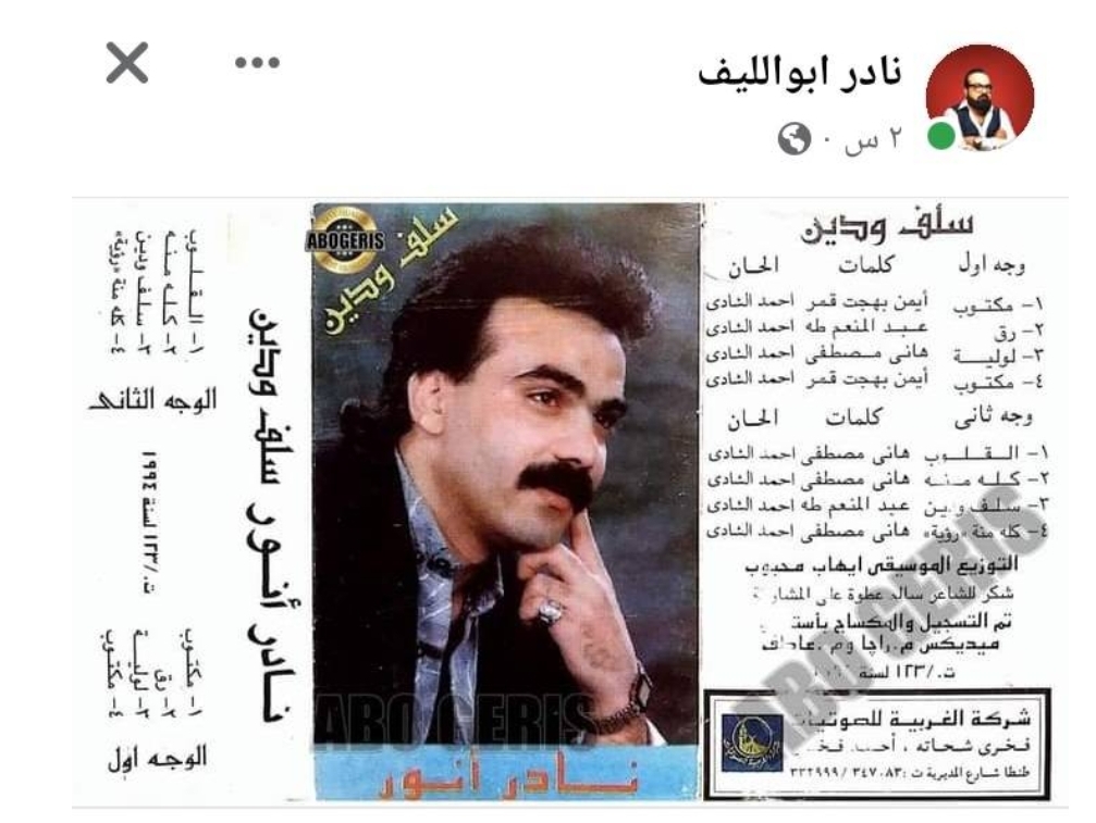وتابع : "اللي بيحترم بيحترم نفسه، ولكن إذا لم تستحِ فافعل ما شئت، وكل واحد معدنه ينضح وبيدل عليه، وتربيته كمان بتبان لأن الجمهور المحترم بيفهم، وبيعرف، وبيحس، ومش هقول غير الله وكيلي وهيجبلي حقي وحسبي الله ونِعم الوكيل، وربّي قادر على كل شيء وحقي رب العرش هيجيبه ليا قريب بأمر الله تعالى.. حبيت بس أعرف السادة المتابعين، وأوضّح الصورة كاملة، وأتمنى النظر في صورة الألبوم، والنظر في تاريخ نزوله، ومعرفة ظهور المؤلف سنة كام، وتعرفوا مين سبب وجوده في الساحة الفنية، بالمناسبة ده أنا نادر أنور، قبل ما تبقى شهرتي أبو الليف، ده للعلم فقط لا غير ولكم جزيل الشكر والتقدير والاحترام. تحياتي".