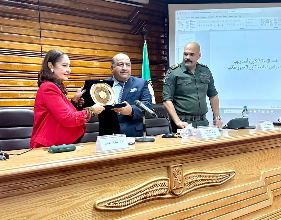 خلال الندوة تم تكريم السفيرة نائلة جبر من قبل الأستاذ الدكتور أحمد رجب، نائب رئيس الجامعة لشؤون التعليم والطلاب.