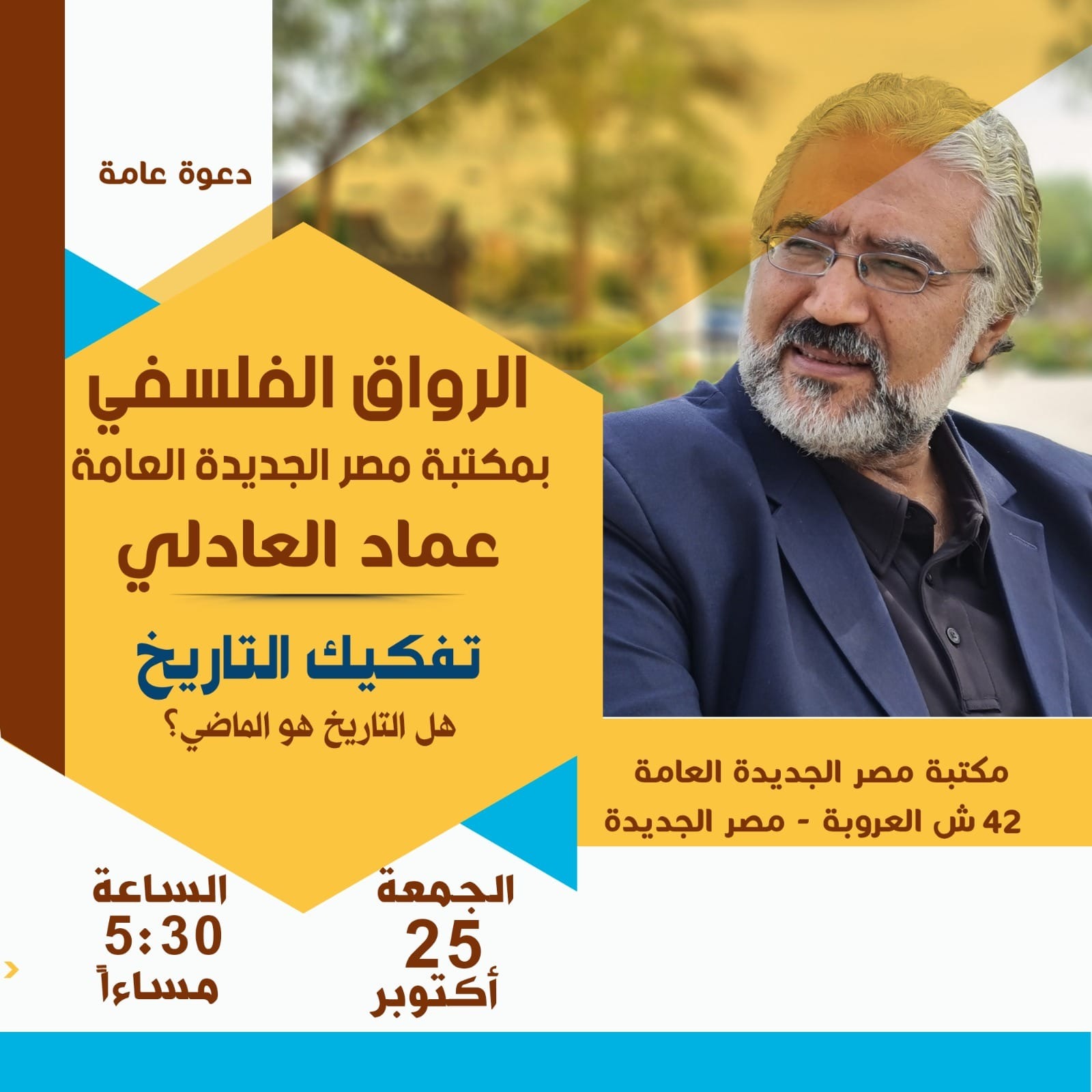 بينما يناقش الرواق الفلسفي بمكتبة مصر الجديدة العامة، (تفكيك التاريخ) حيث يتناول التاريخ فلسفيا ونيتشه والتاريخ، حفريات ميشال فوكو.