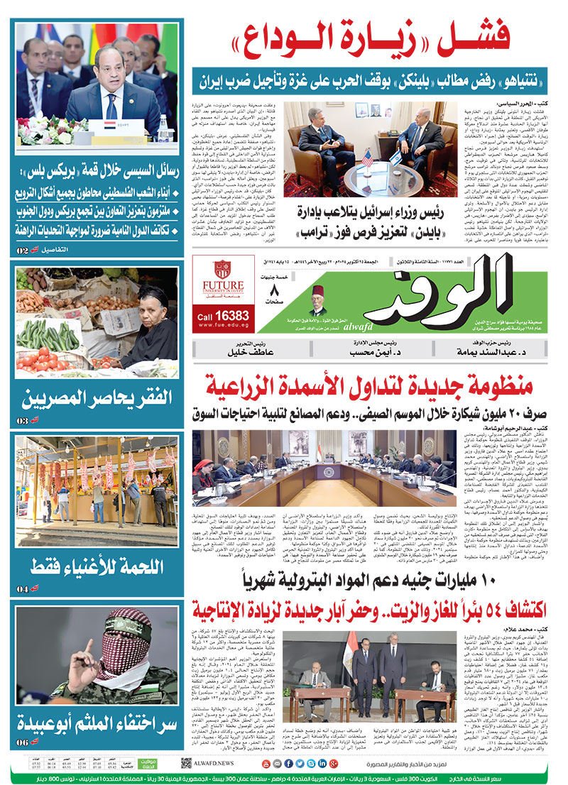 تنشر جريدة الوفد في عددها الصادر، غدًا الجمعة، الكثير من الموضوعات والتقارير الإخبارية المهمة، أبرزها:فشل ”زيارة الوداع".