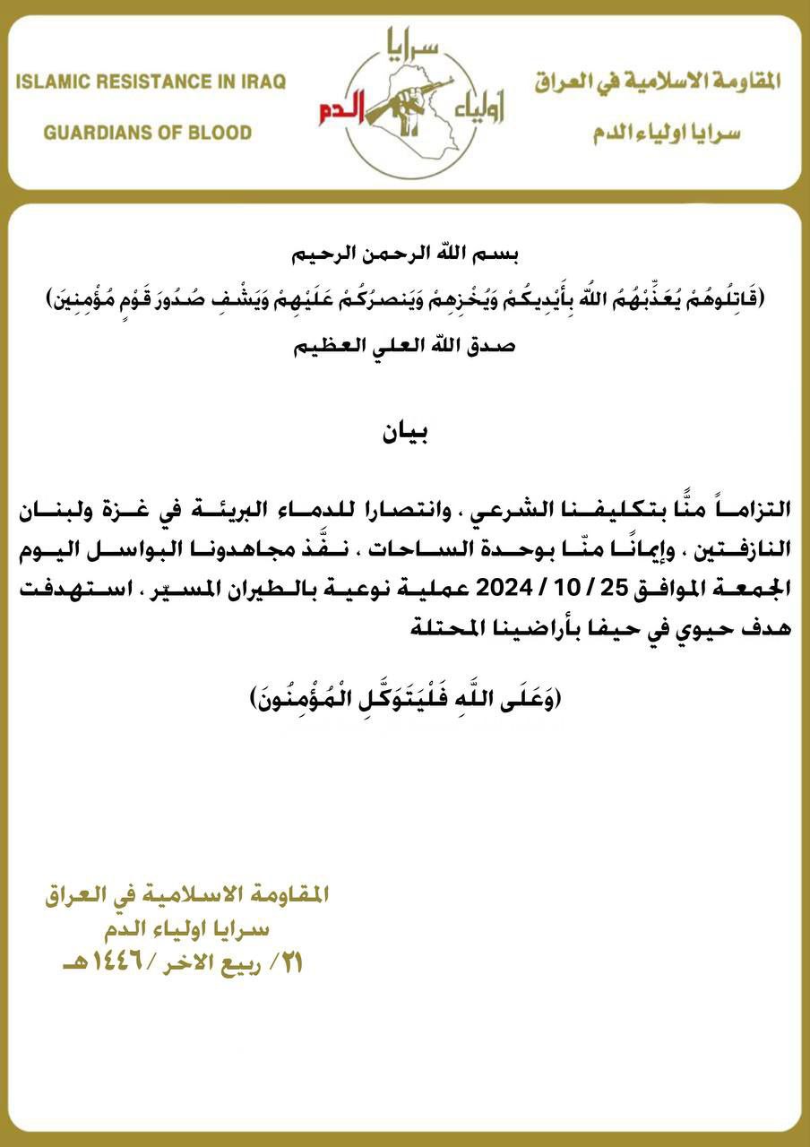 وقالت المقاومة العراقية في بيان اليوم الجمعة: التزاماً منّا بتكليفنا الشرعي ، وانتصارًا للدماء البريئة في غزة ولبنان النازفتين ، وإيمانًا منّا بوحدة الساحات، نفّذَ مجاهدونا البواسل اليوم الجمعة الموافق 25 / 10 / 2024 عملية نوعية بالطيران المسيّر ، استهدفت هدف حيوي في حيفا بأراضينا المحتلة .