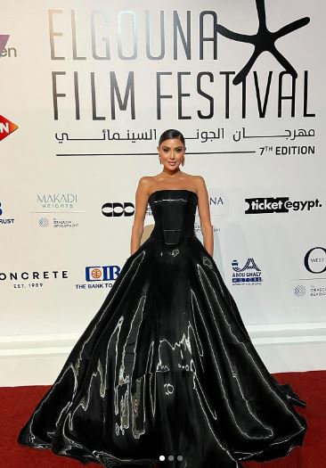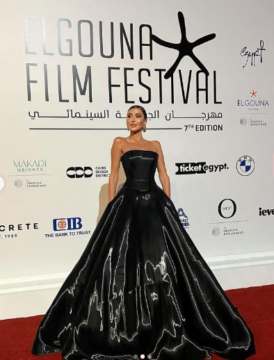 تتألق على السجادة الحمراء لمهرجان الجونة السينمائي، حيث ظهرت بالأناقة في فستان من الساتان السائل باللون الأسود من تصميم مايكل سينكو. تحفة خالدة لليلة من السحر السينمائي!