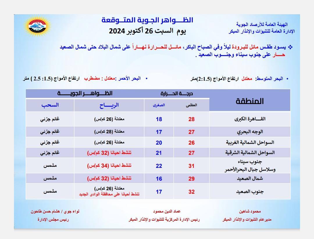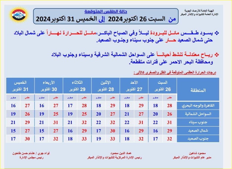 أعلنت الهيئة العامة للأرصاد الجوية عن تفاصيل حالة الطقس المتوقعة في الفترة من السبت 26 أكتوبر إلى الخميس 31 أكتوبر 2024، إذ يسود طقس مائل للبرودة ليلًا وفي الصباح الباكر مائل للحرارة نهارًا على شمال البلاد حتى شمال الصعيد، حار على جنوب سيناء وجنوب الصعيد.