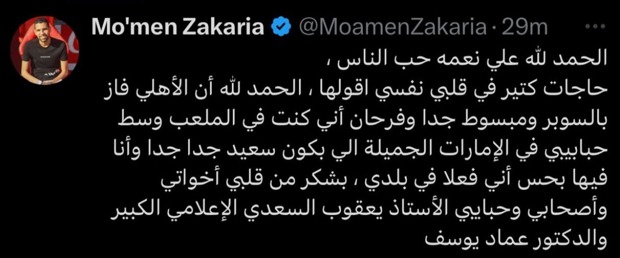 رسالة مؤمن زكريا بعد تتويج الأهلي بالسوبر المصري
