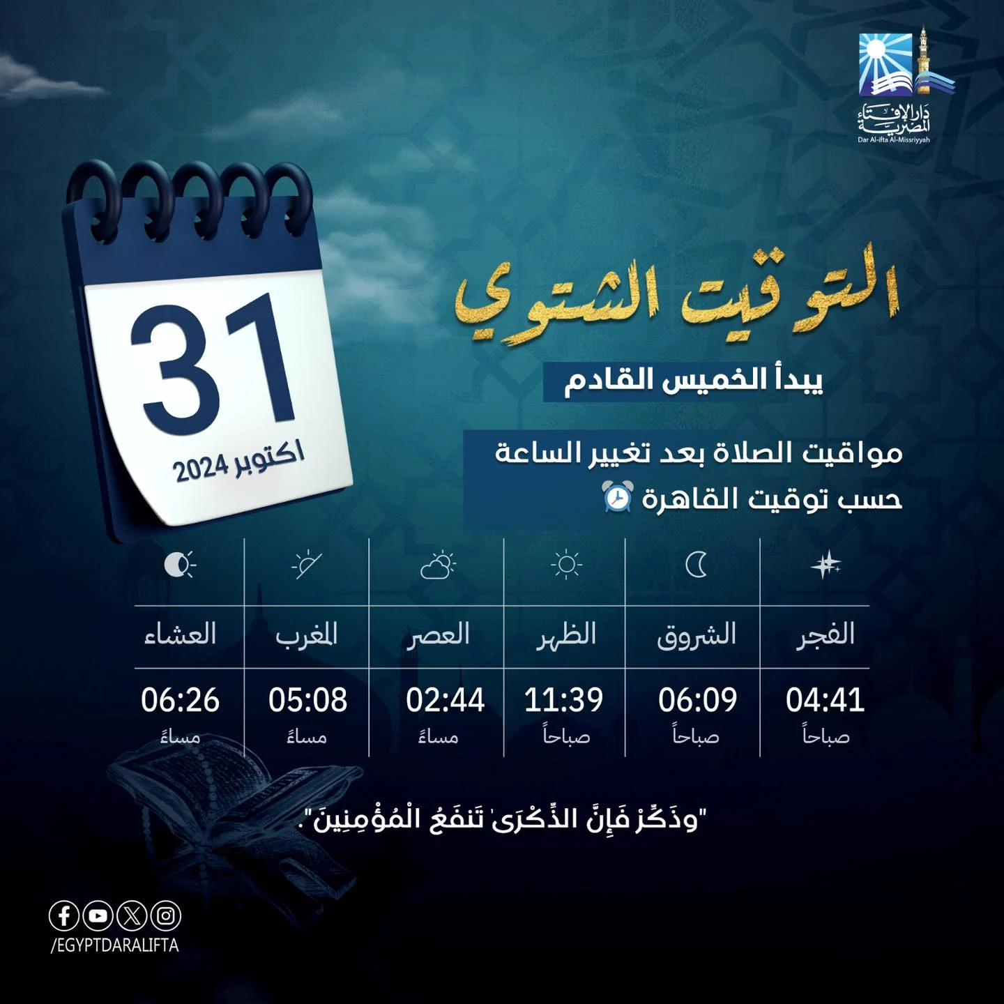 أعلنت دار الإفتاء المصرية مواقيت الصلاة الجديدة حسب التوقيت الشتوي، وذلك بعد تغيير الساعة إلى التوقيت الشتوي الجديد، والذي سيبدأ رسميًا اعتبارًا من يوم الخميس 31 أكتوبر الجاري.