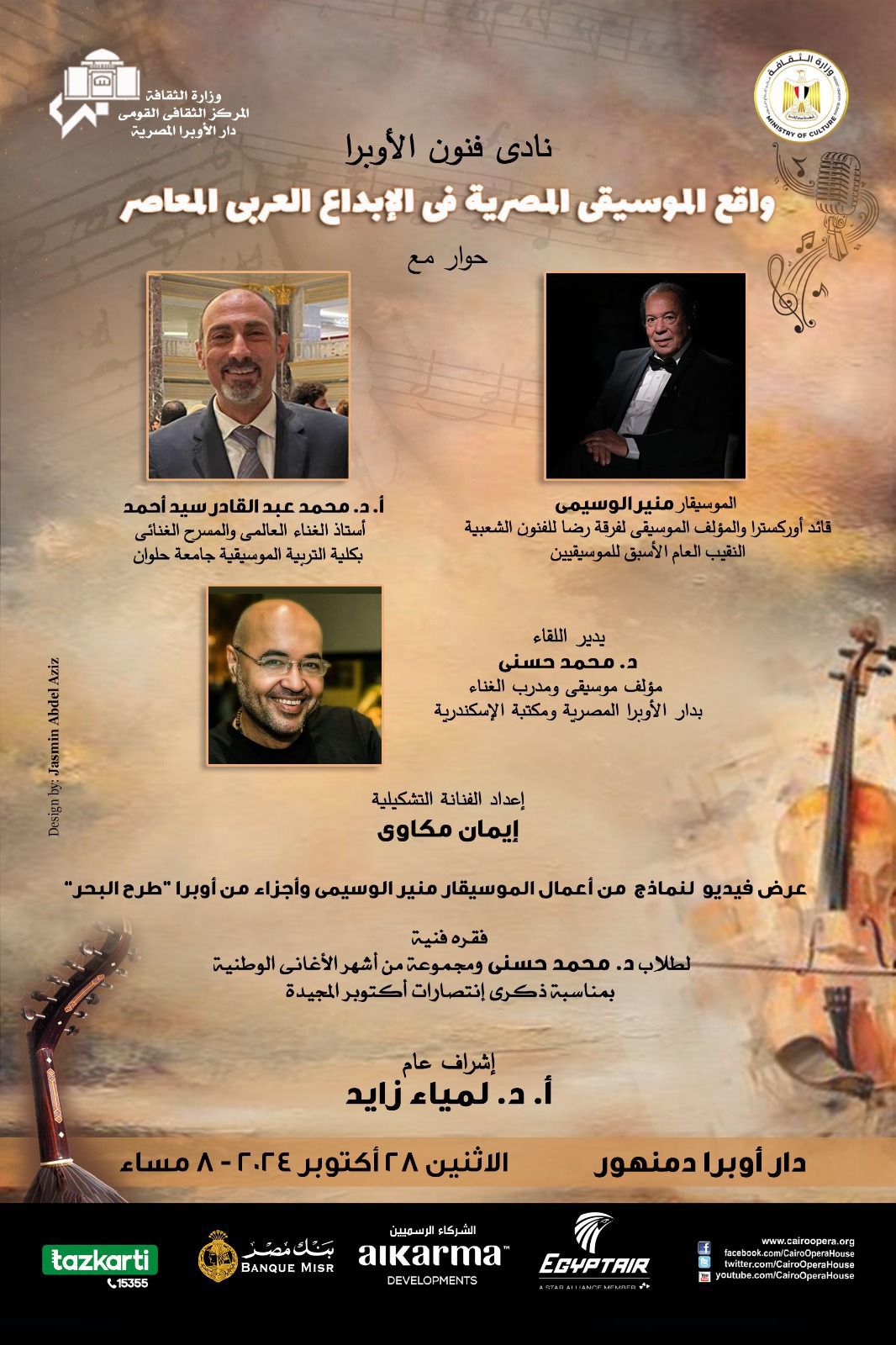 تقدم دار الأوبرا المصرية برئاسة الدكتورة لمياء زايد، ضمن نشاطها الثقافي والفكري لقاءً من سلسلة فعاليات نادي فنون الأوبرا بعنوان "واقع الموسيقى المصرية في الإبداع العربي المعاصر"، في إطار فعاليات وزارة الثقافة الهادفة إلى إجراء حوار إبداعى فى مختلف المجالات الفنية والثقافية، وذلك فى الثامنة مساء الاثنين ٢٨ اكتوبر على مسرح أوبرا دمنهور.