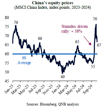 ويوضح QNB أنه على الرغم من ردود الفعل الأولية في الأسواق، لا يزال المحللون يشككون في مدى التزام الحكومة الصينية بتنفيذ عمليات تدخل كبيرة ومستدامة لدعم الاقتصاد، وما إذا كان ذلك سيؤثر بقوة على معنويات المستهلكين والنشاط الحقيقي.