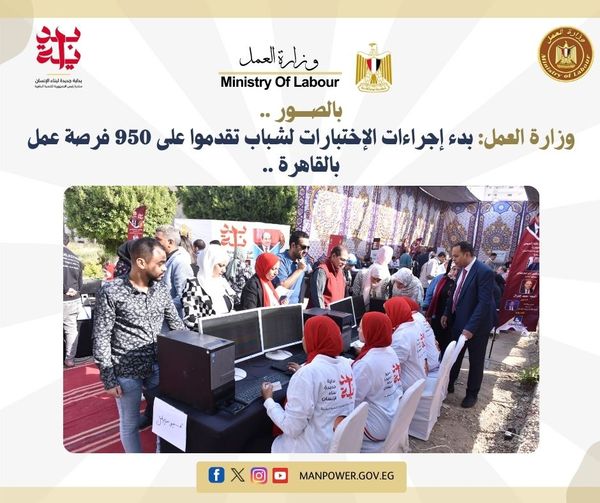 أعلنت وزارة العمل، عن بدء إجراء المُقابلات الشخصية والإختبارات، للشباب الذين تقدموا للحصول على 950 فرصة عمل في محافظة القاهرة، وذلك بالتنسيق والتعاون مع 22 شركة تابعة القطاع الخاص، والتي جرى الإعلان عنها منذ أيام.