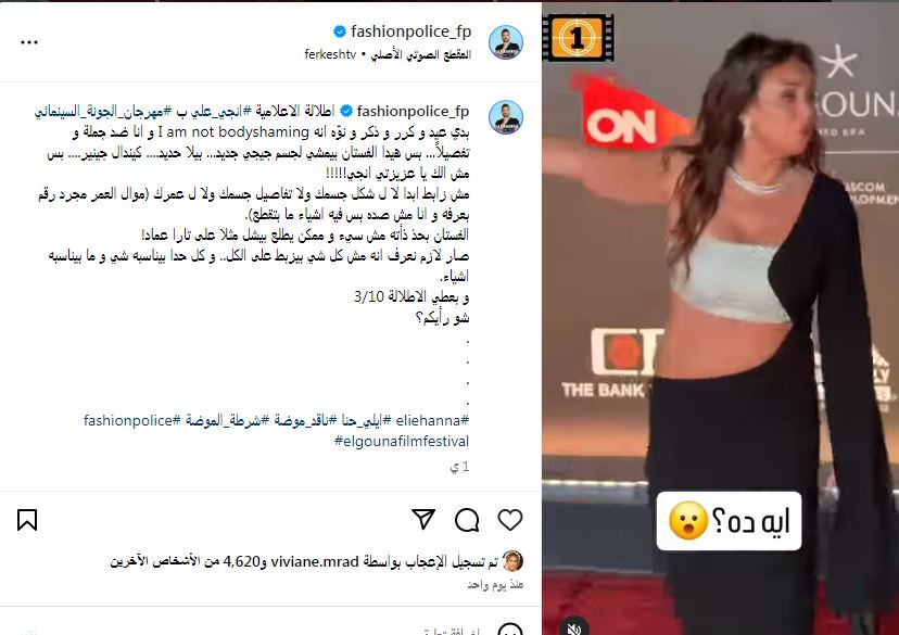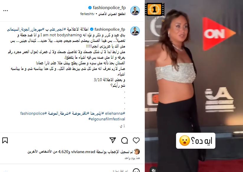 أثارت الإعلامية إنجي علي حالة من الجدل حول إطلالتها الأخيرة خلال حضورها حفل افتتاح مهرجان الجونة السينمائي، بدورته السابعة، بحضور كوكبة من نجوم ونجمات الفن، وهذا ما دفع ناقد الموضة إيلي حنا على إبداء رأيه عن إطلالتها عبر الصفحة الرسمية لشرطة الموضة بـ"إنستجرام".