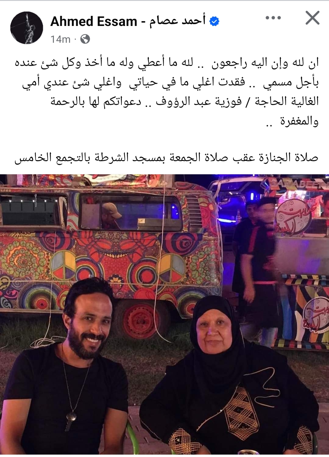 يذكر أن “أحمد عصام” أعلن وفاة والدته عبر حسابه بموقع التواصل الاجتماعى "فيسبوك"، كاتبا: "إنا لله وإنا إليه راجعون، لله ما أعطى وله ما أخذ وكل شيء عنده بأجل مسمى، فقدت أغلى ما في حياتي وأغلى شيء عندي، أمي الغالية الحاجة فوزية عبد الرؤوف، دعواتكم لها بالرحمة والمغفرة".