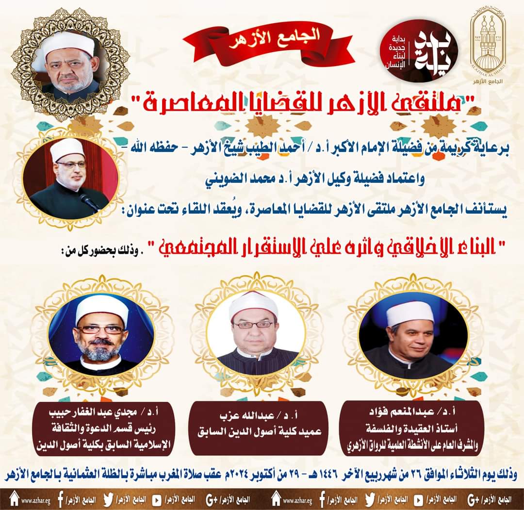 جدير بالذكر أن ملتقى "الأزهر للقضايا المعاصرة" يُعقد الثلاثاء من كل أسبوع في رحاب الجامع الأزهر الشريف، تحت رعاية فضيلة الإمام الأكبر وبتوجيهات من فضيلة الدكتور محمد الضويني وكيل الأزهر الشريف، حيث كان بمسمى "شبهات وردود" وتم تغييره لملتقى الأزهر للقضايا المعاصرة، بعد نجاحه طوال شهر رمضان والذي كان يعقد يوميًا عقب صلاة التراويح، ويتناول هذا الملتقى في كل حلقة قضية تهم المجتمع والوطن، والعالَمَين العربي والإسلامي.