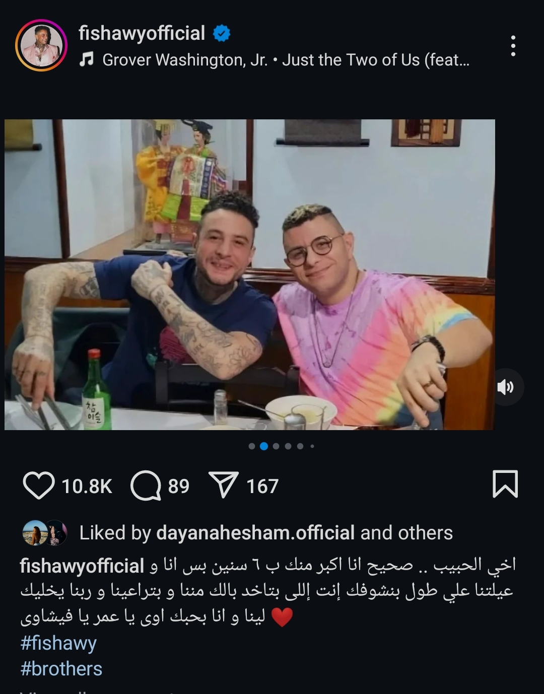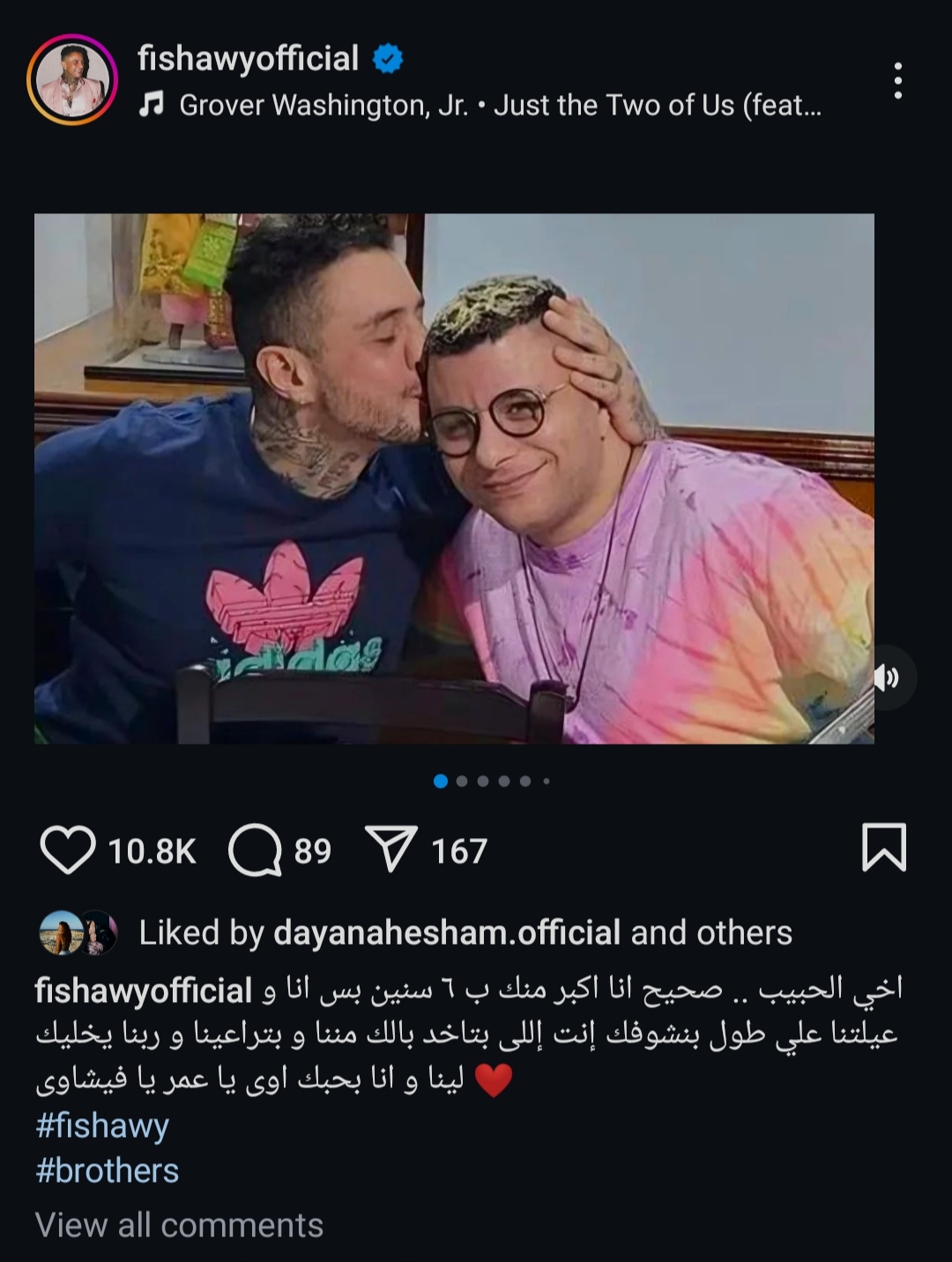 وشارك أحمد الفيشاوي جمهوره عبر صفحته الرسمية على موقع "إنستجرام" مجموعة صور له برفقة شقيقه من مناسبات مختلفة وجميلة تجمعهم في اماكن متعددة، وعلق قائلا: «أخي الطحبيب.. صحيح أنا أكبر منك بـ 6 سنين، بس أنا وعيلتنا على طول بنشوفك أنت اللي بتاخد بالك مننا وبتراعينا».