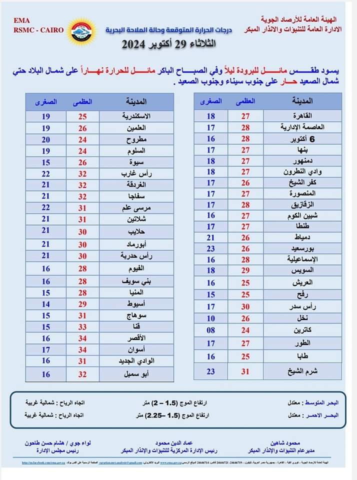 درجات الحرارة وحالة الطقس اليوم.. يشهد اليوم الثلاثاء الموافق 29 أكتوبر، طقس مائل للحرارة نهارا على شمال البلاد وحتى شمال الصعيد وحار على جنوب سيناء وجنوب الصعيد، على أن يسود طقس مائل للبرودة في الليل.