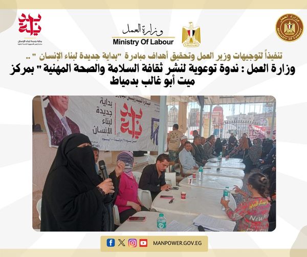 نظمت مديرية العمل بمحافظة دمياط ، ندوة للتوعية بمركز شباب ميت أبو غالب بحضور ٢٠٠ من المواطنين للتوعية في مجال نشر ثقافة السلامة والصحة المهنية ، وكذلك التعريف بالخدمات التى تقدمها مديرية العمل بدمياط وخاصة مركز التدريب التابع للمديرية وكذلك وحدة التدريب المتنقلة وما يتم بها من دورات تدريبيه تسهم في تأهيل الشباب لسوق العمل.