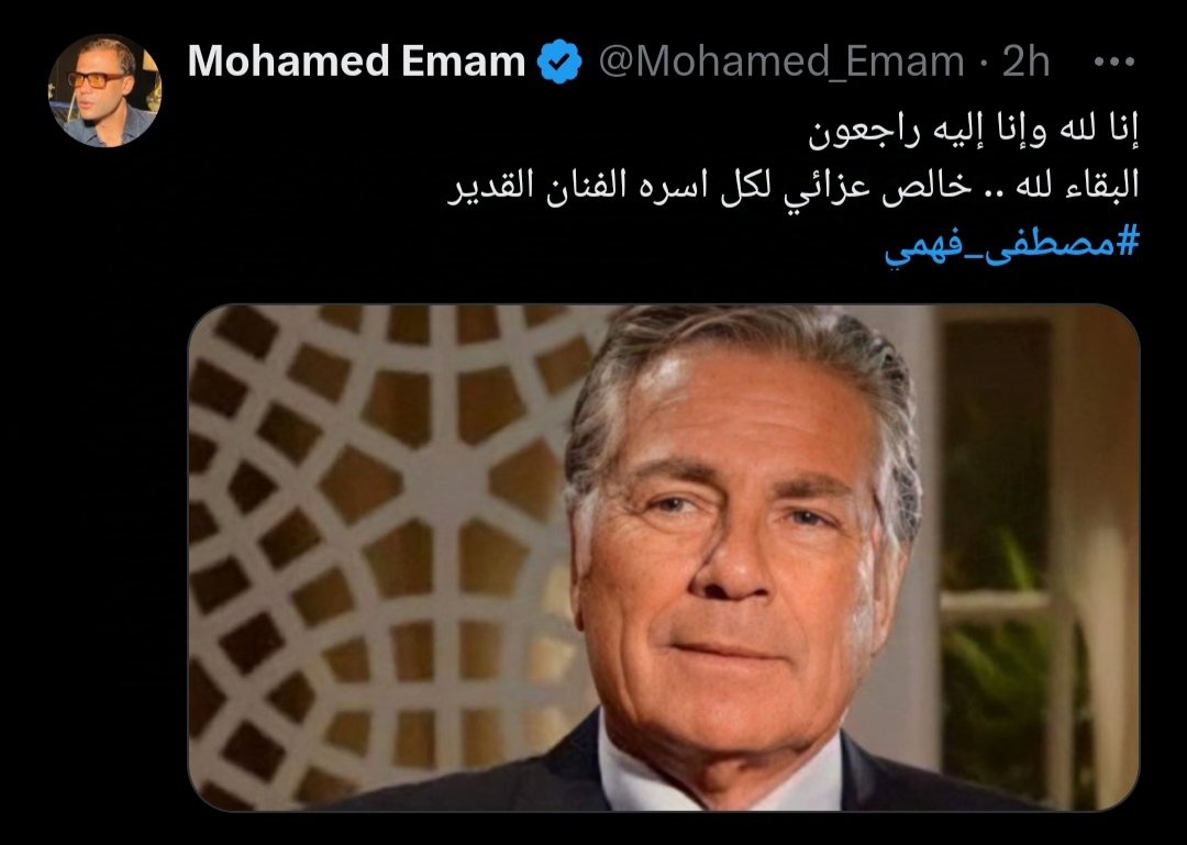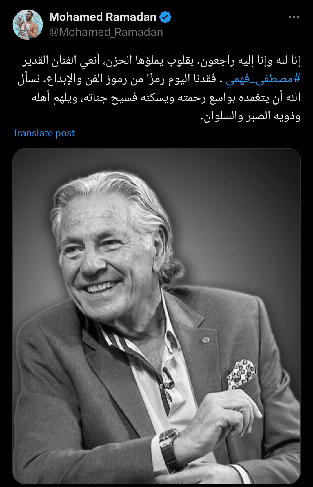 ونشر رمضان صورة للراحل عبر حسابه الرسمي بموقع التواصل الاجتماعي "إكس" تويتر سابقا، وقال:"إنا لله وإنا إليه راجعون.. بقلوب يملؤها الحزن، أنعي الفنان القدير مصطفى فهمي".