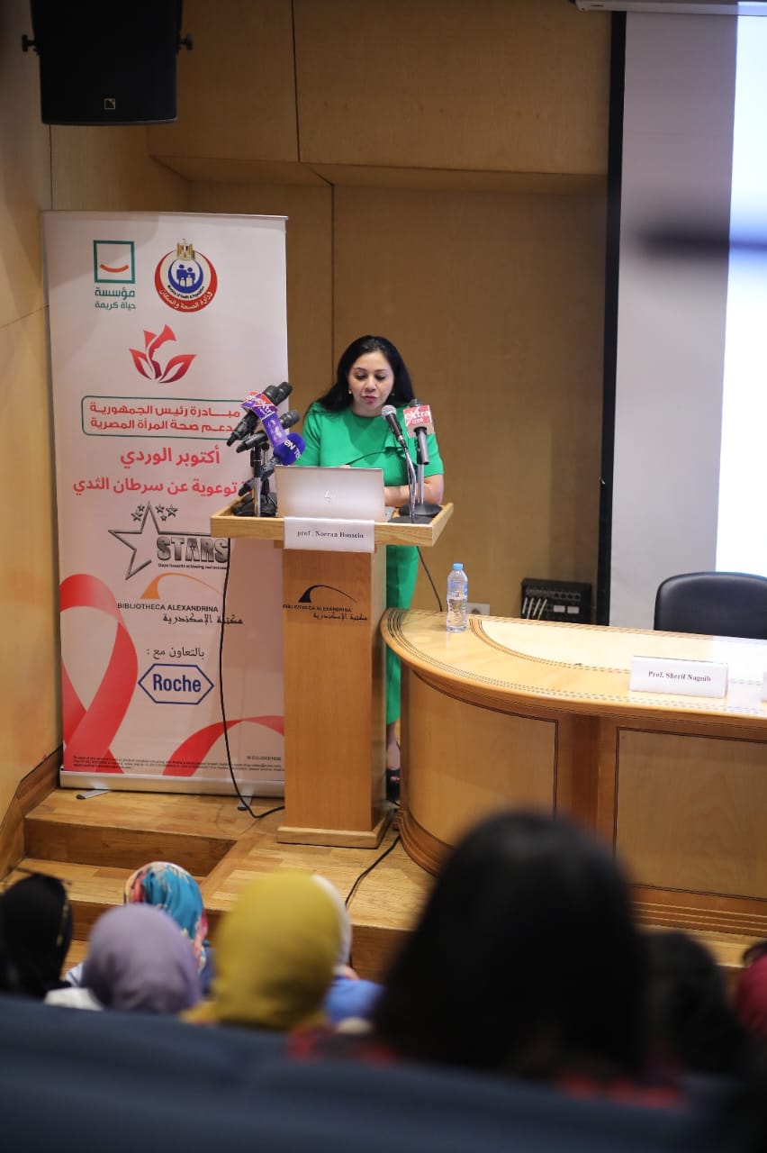 وفي ذات السياق، أضاف الدكتور حاتم أمين المدير التنفيذي لمبادرة دعم صحة المرأة، أنه في إطار الإحتفال بأكتوبر الوردي، تم إضاءة مكتبة الاسكندرية باللون الوردي يوم السبت 19 أكتوبر 2024، موضحًا أن هذه الاضاءة المميزة للتعبير عن التزام المبادرة بدعم التوعية عن أورام الثدي والكشف المبكر عنه، ويعتبر هذا بمثابة تأكيد لزيادة الوعي بأهمية الكشف المبكر، وأهمية العمل الجماعي في مواجهة التحديات الصحية، كما أنها تعكس الدور الرائد الذي تلعبه مبادرة صحة المرأة في نشر الوعي المجتمعي بأهمية الكشف المبكر عن أورام الثدي، مشيرًا إلى أنه تم إلقاء محاضرة توعوية حول أهمية الكشف المبكر عن الأورام وحاضرها الدكتورة نوران حسين نائب المدير التنفيذي للمبادرة الرئاسية لدعم صحة المرأة، وأكد أن هذا اليوم ضم ايضًا عدد من الأطباء القائمين على مبادرة صحة المرأة