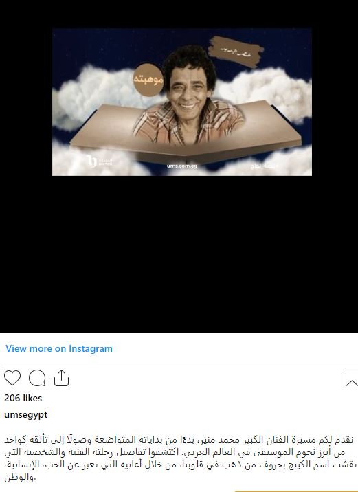 على صعيد آخر، طرحت الشركة المتحدة للخدمات الإعلامية، فيلمًا تسجيليًا قصيرًا عن مشوار الكينج محمد منير الفني بصوت الفنان أحمد أمين، وجاء ذلك خلال مقطع فيديو عبر حسابها الرسمي بموقع الصور والفيديو "إنستجرام ".