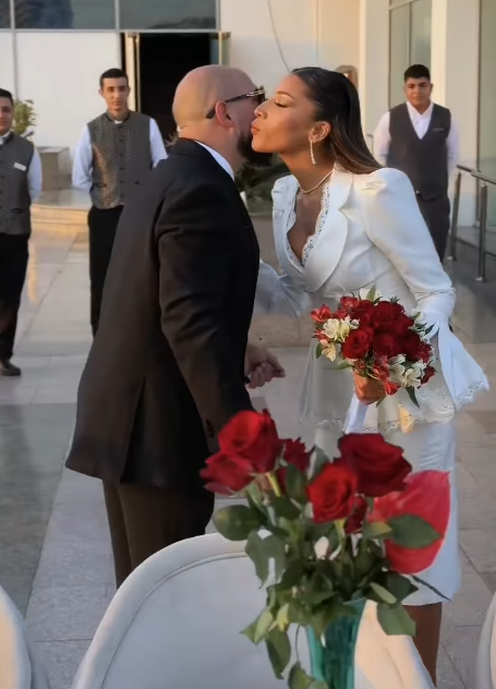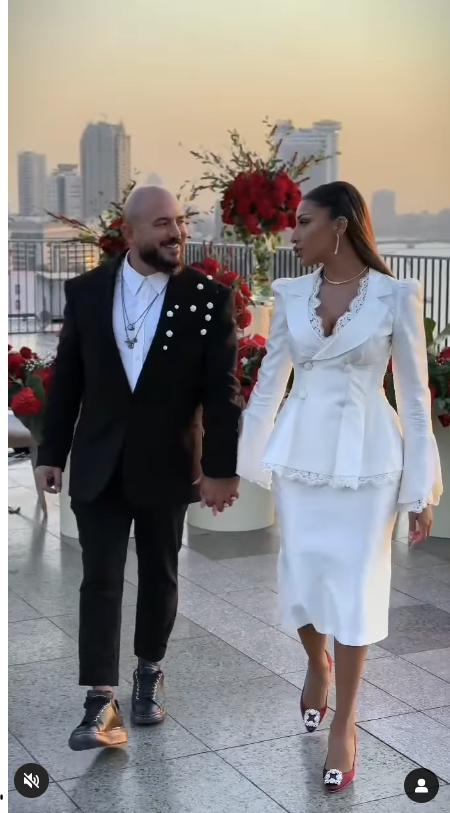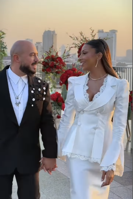 وبدت العروس نوف بإطلالة ناعمة وجذابة، حيث ارتدت فستان زفاف باللون أبيض أنيق ولافت، وجاء بتصميم مميز مكونًا من قطعتين، بليزر ذا فتحة صدر جريئة وأكمام طويلة وجيب قصير أسفل الركبة، ما أبرز أنوثتها وعكس قوامها الرشيق الممشوق.